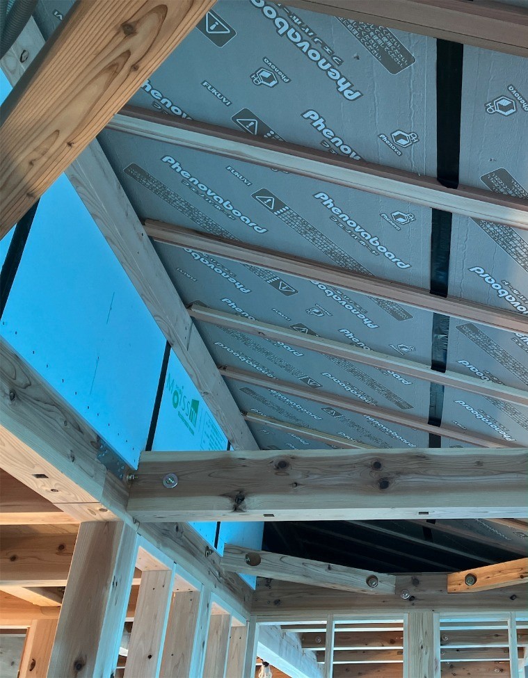 屋根断熱のフェノバボードも動かないように固定されていますね👇