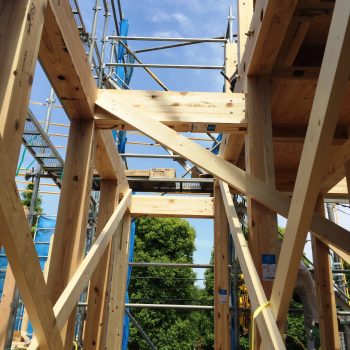 こちら、建ったばかりの軸組みのあちらこちらに斜めの材が張られています。