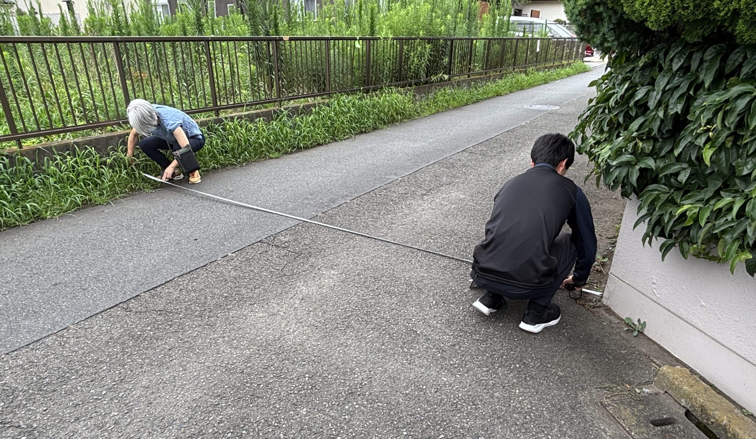 道路の幅も芹沢さんに手伝っていただき、一緒に測りました。どうしても一人では測れないところは、こうしてサポートしてもらいながら進めています。