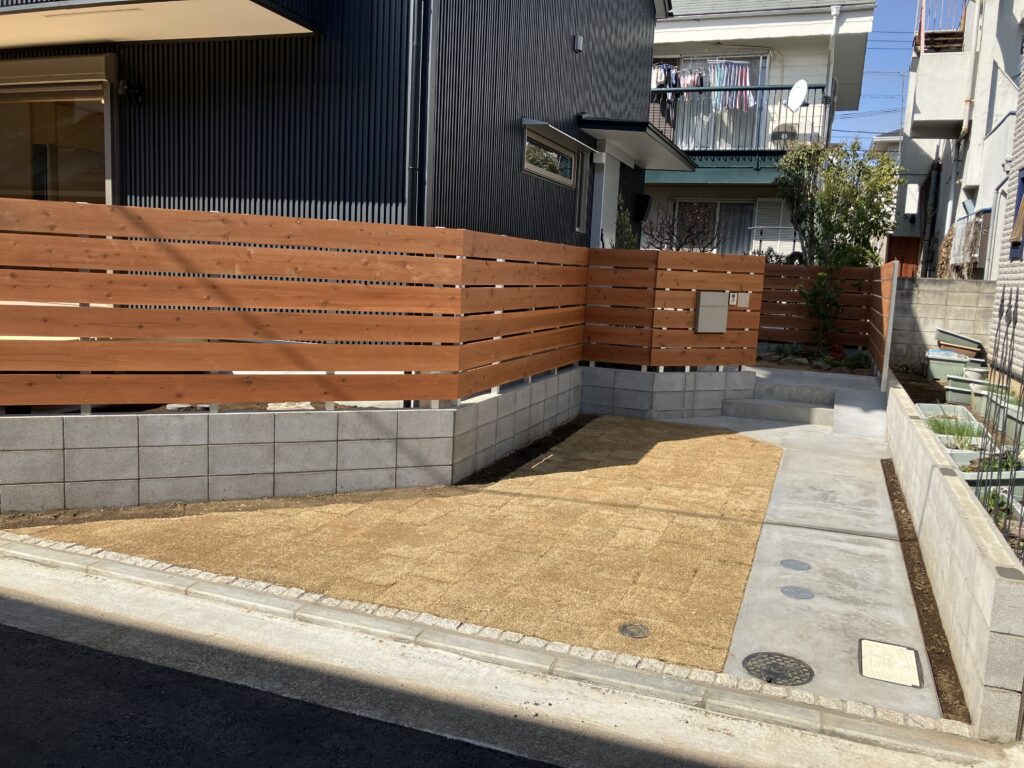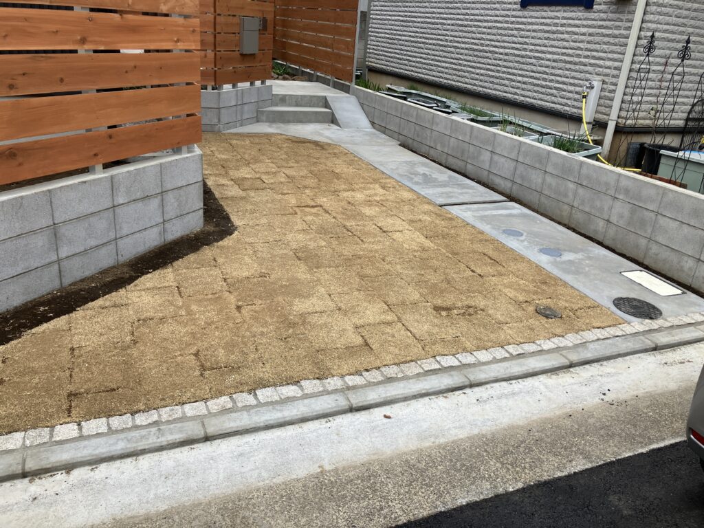 ひとつ目のお庭は駐車場。芝の上に駐車出来るようにしっかりと締め固めてもらいました。芝の周りには季節の花々を植えていきます。