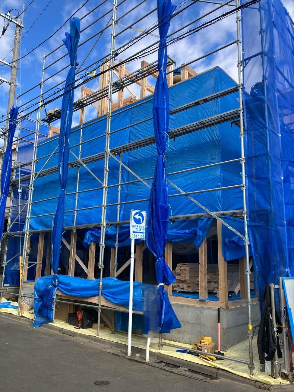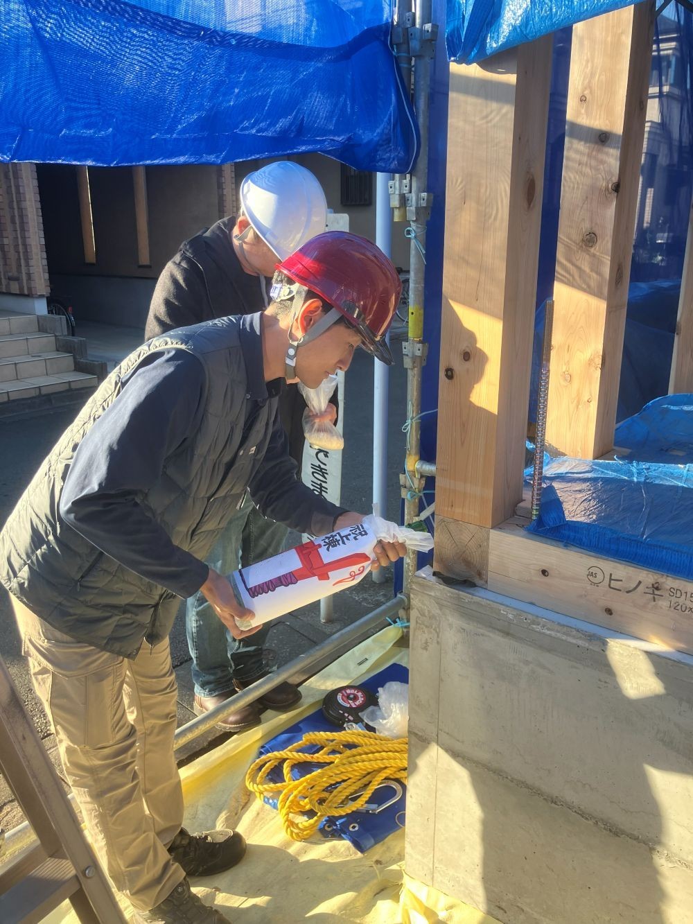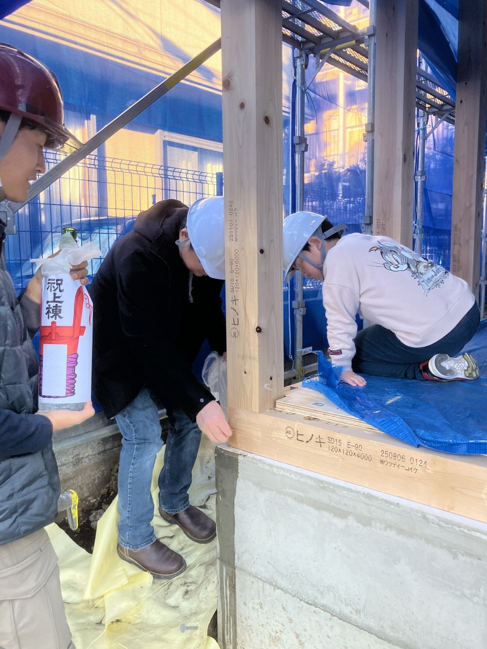 工事が無事に進むよう、お客様とご一緒に上棟した建物の四隅をお清めいたしました。