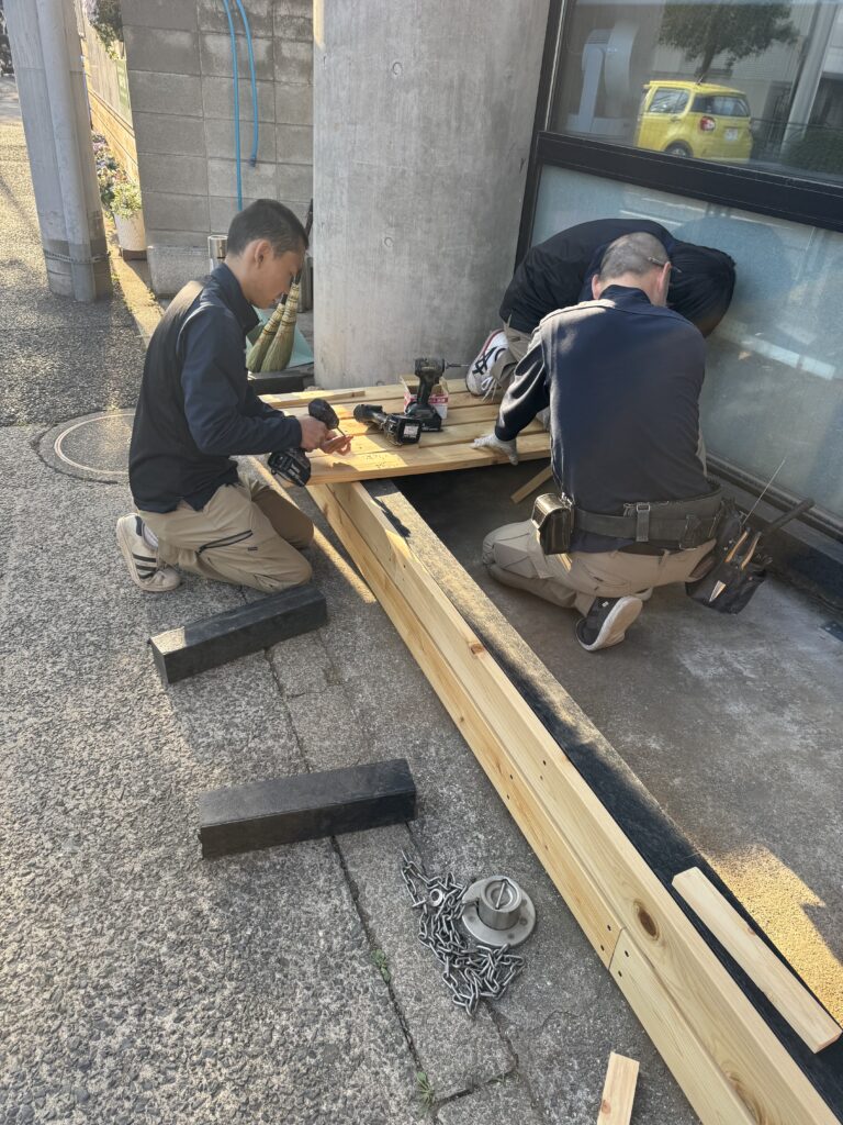 岡庭建設の研修は、座学だけではありません。 翌日の4月2日からは、研修を兼ねて本社前のウッドデッキ改修工事に挑みました。