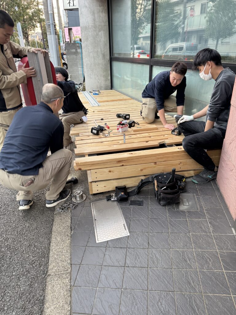 新人大工が力を合わせ、先輩のサポートを受けながら試行錯誤すること2日間……。 ついに、ウッドデッキが完成しました!