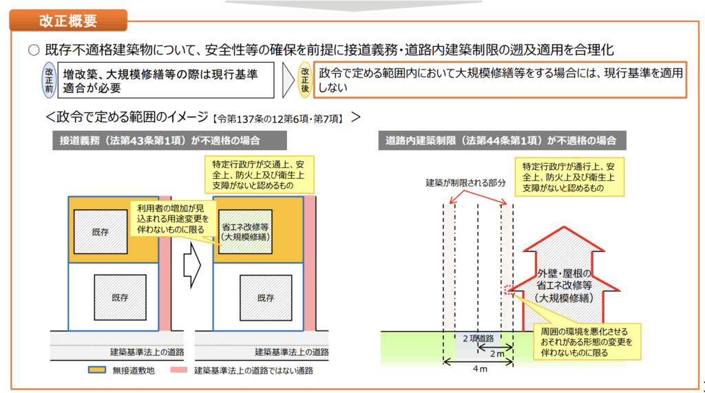 皆さん、こんにちは!IKEDA隊長です。日々の暮らしの中で、住まいの性能を向上させたい、より快適な空間にしたい、と考えることはありませんか。特に、長く住み続けているお住まいでは、断熱性能の向上や耐震性の強化など、現代の基準に合わせたリノベーションを検討される方も多いと思います。しかし、敷地の条件によっては、大規模なリフォームや増改築が法律上難しい、と諦めてしまっているケースも少なくありません。その代表的な例が、建築基準法で定められた「接道義務」を満たしていない、いわゆる「再建築不可物件」です。これは、建物の敷地が幅員4m以上の道路に2m以上接していなければならない、という決まりです。万が一の火災や救急活動の際に、消防車や救急車がスムーズに近づけるようにするための、安全上非常に重要なルールなのです。このルールがあるために、道路に面していない路地の奥にあるお住まいなどは、たとえ今建物が建っていても、一度更地にしてしまうと新しい家を建てることができず、大規模なリフォームも難しい、というのがこれまでの常識でした。しかし、令和6年(2024年)4月1日に、この状況に一筋の光を差し込む、重要な法律の改正が施行されました。本日は、この改正について、意外と知られていないので触れておきたいと思います。