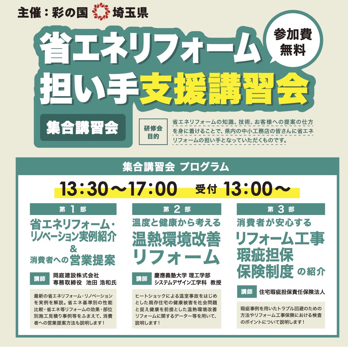 埼玉県主催の「省エネリフォーム担い手講習会」が開催され、その講師役を努めさせて頂きました。