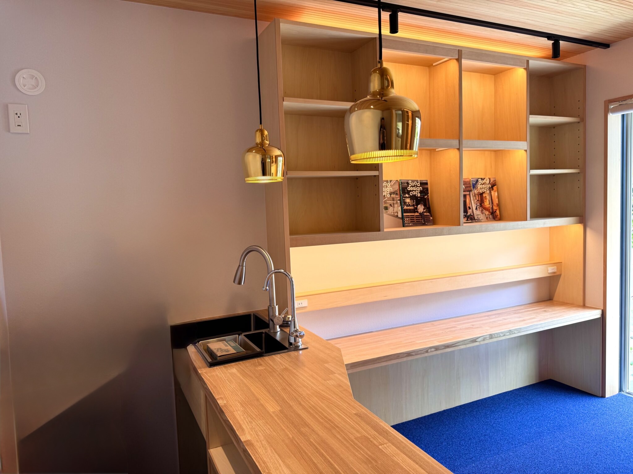まず印象的だったのは、ブックカフェスペースです。6帖という限られた空間ながら、まったく狭さを感じさせない設計となっています。木の温もりを活かした空間に、アクセントとなる青いカーペットがとても効いています。そして何より目を引くのが、アアルトの照明です。フィンランドの建築家アルヴァ・アアルトの照明器具が、空間全体をとてもオシャレに演出しており、まさにブックカフェにふさわしい上質な雰囲気を醸し出しています。限られた面積の中でも、視線の抜けや天井高を工夫することで、実際の面積以上の開放感を実現できることを改めて確認できました。