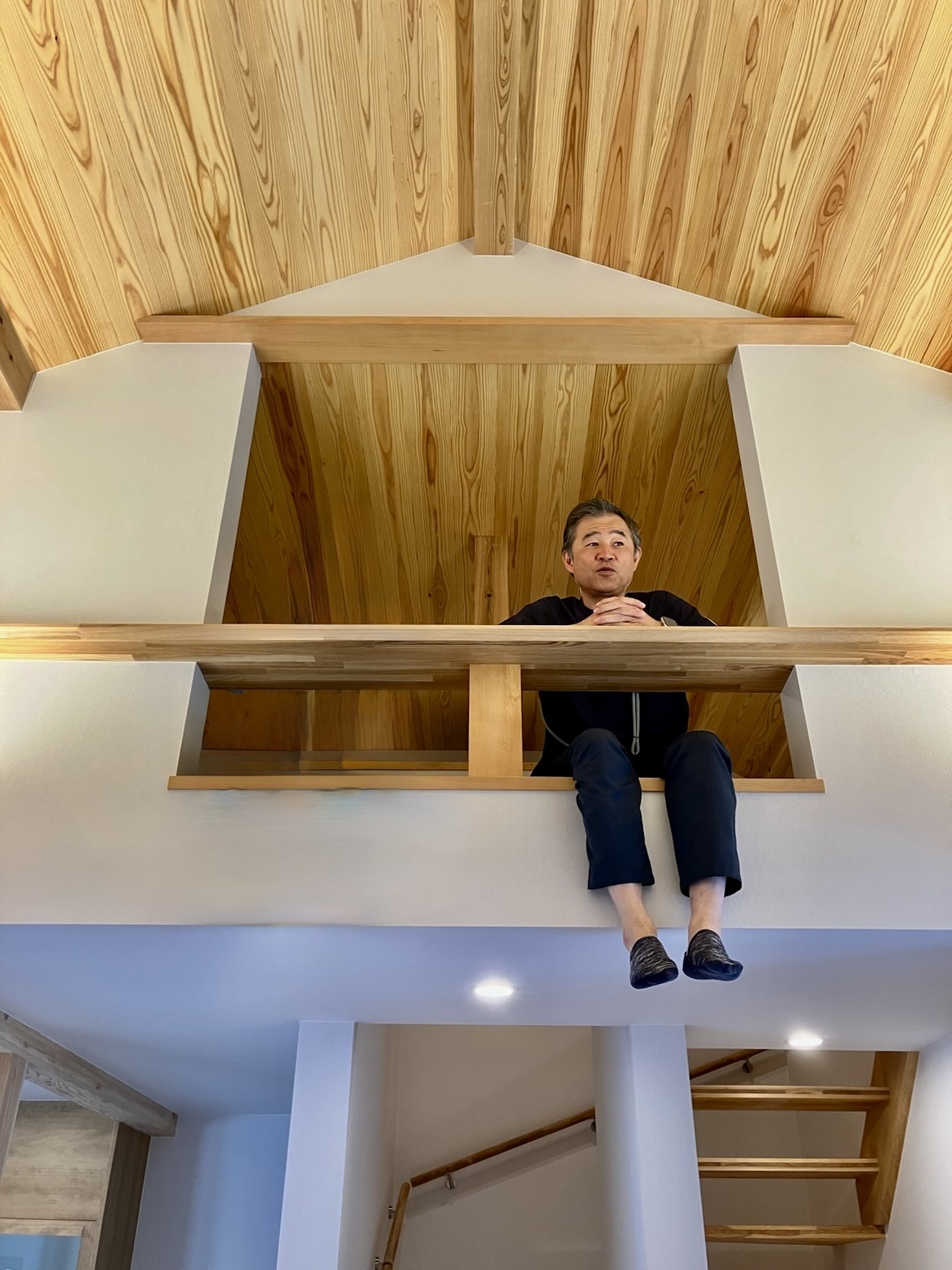 今回の建物の中にまた別の居場所が・・・その居場所で若手のこんちゃんと一緒に語り合う時間は、とても有意義でした。ただの壁にすることだけでなく、開口し手すりがあることで人の居場所、そして居心地が生まれる、そのような感性空間のあり方について学べた気がしますし、今後より良い住まいづくりが実現できると改めて感じています。