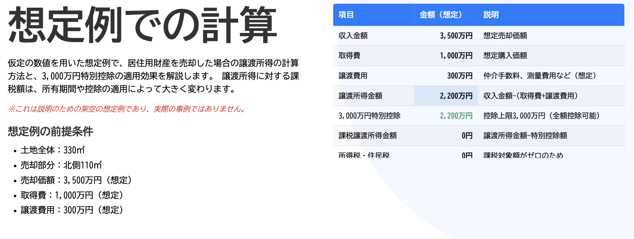 ここでは仮の数値を用いた想定例により、居住用財産を売却した場合の譲渡所得の計算方法と「3,000万円特別控除」を適用した際の効果を解説しますね。