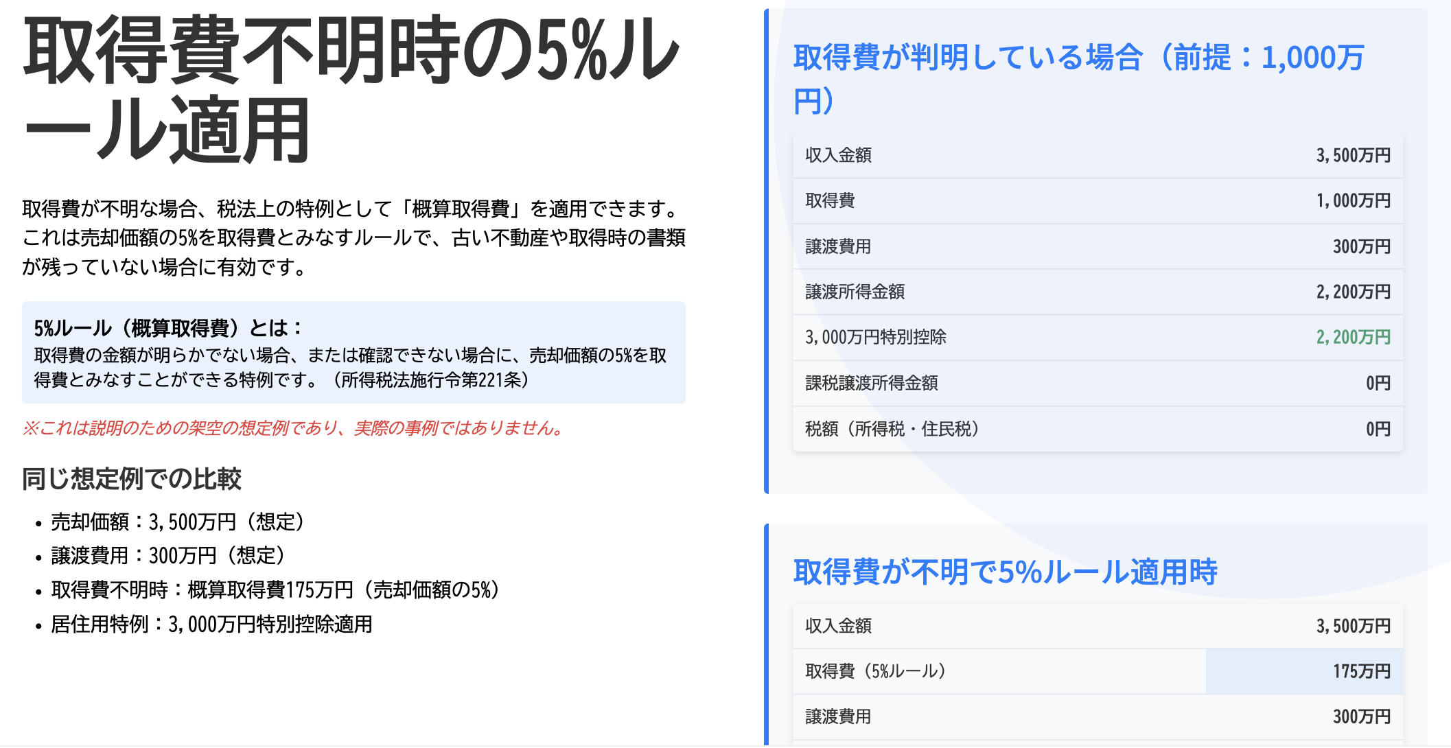 この想定例では、取得費がわかれば課税額ゼロ、不明だと25万円が課税対象になります。
