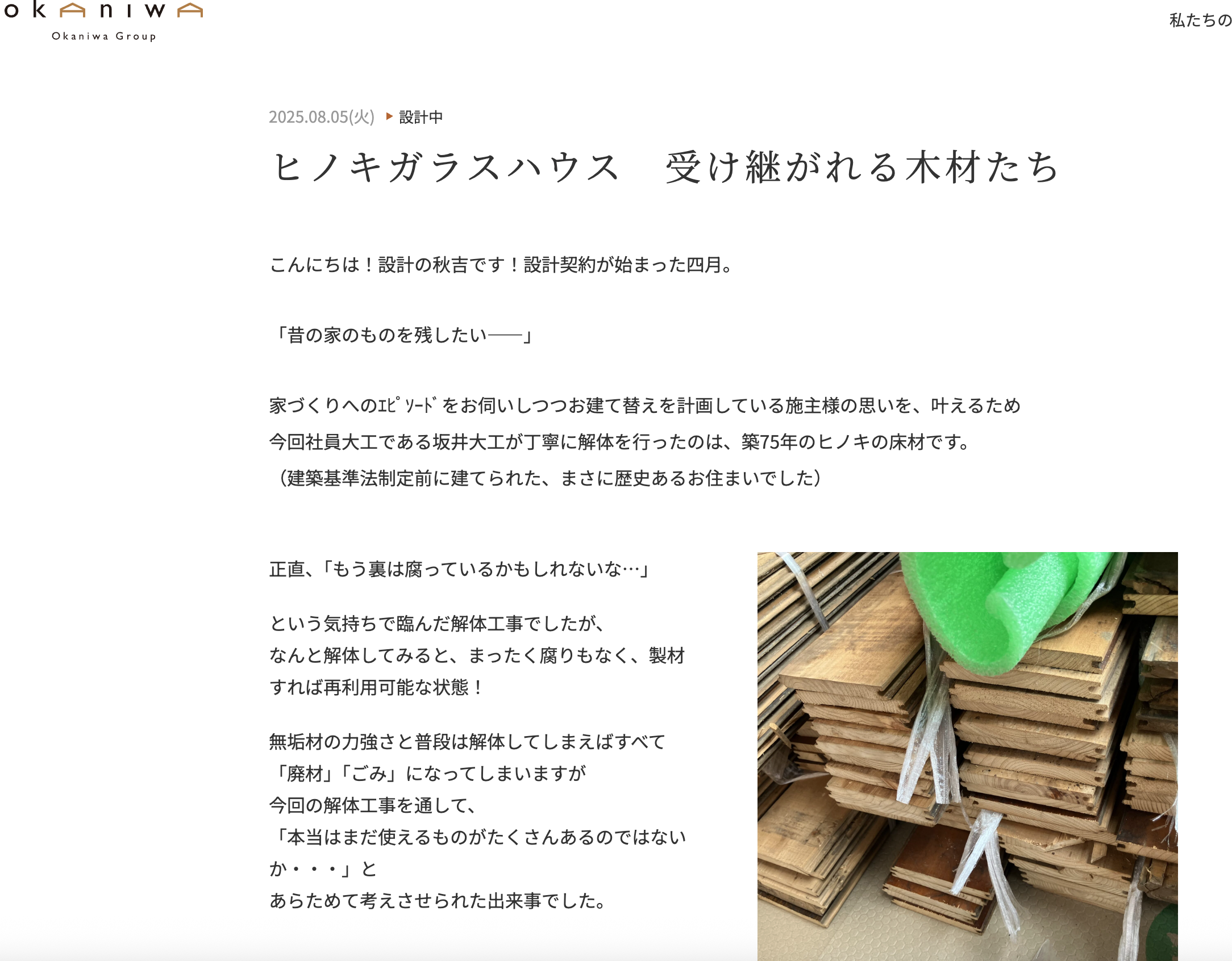 「昔の家のものを残したい」という住まい手様の想いを叶えるため、解体工事の中で、社員大工の坂井くんが貴重な材料の保存作業に携わりました。実は「もう裏は腐っているかもしれない」という懸念もあったのですが、なんと丁寧に取り外してみると、ヒノキの床材は腐りも少なく、削る等すれば再利用可能な状態だったのです。無垢材の力強さに改めて驚・・・・。普段は解体すればすべて「廃材」「ごみ」になってしまいますが、今回の解体工事を通して、「本当はまだ使えるものがたくさんあるのではないか」と考えさせられた気がします。この床材は、一部に利用していきますが、これから100年、いやもっと先まで受け継がれていくはずです。世代を超えて住み継ぐことの意義、歴史を大切にすることの価値を、あらためて実感しています。