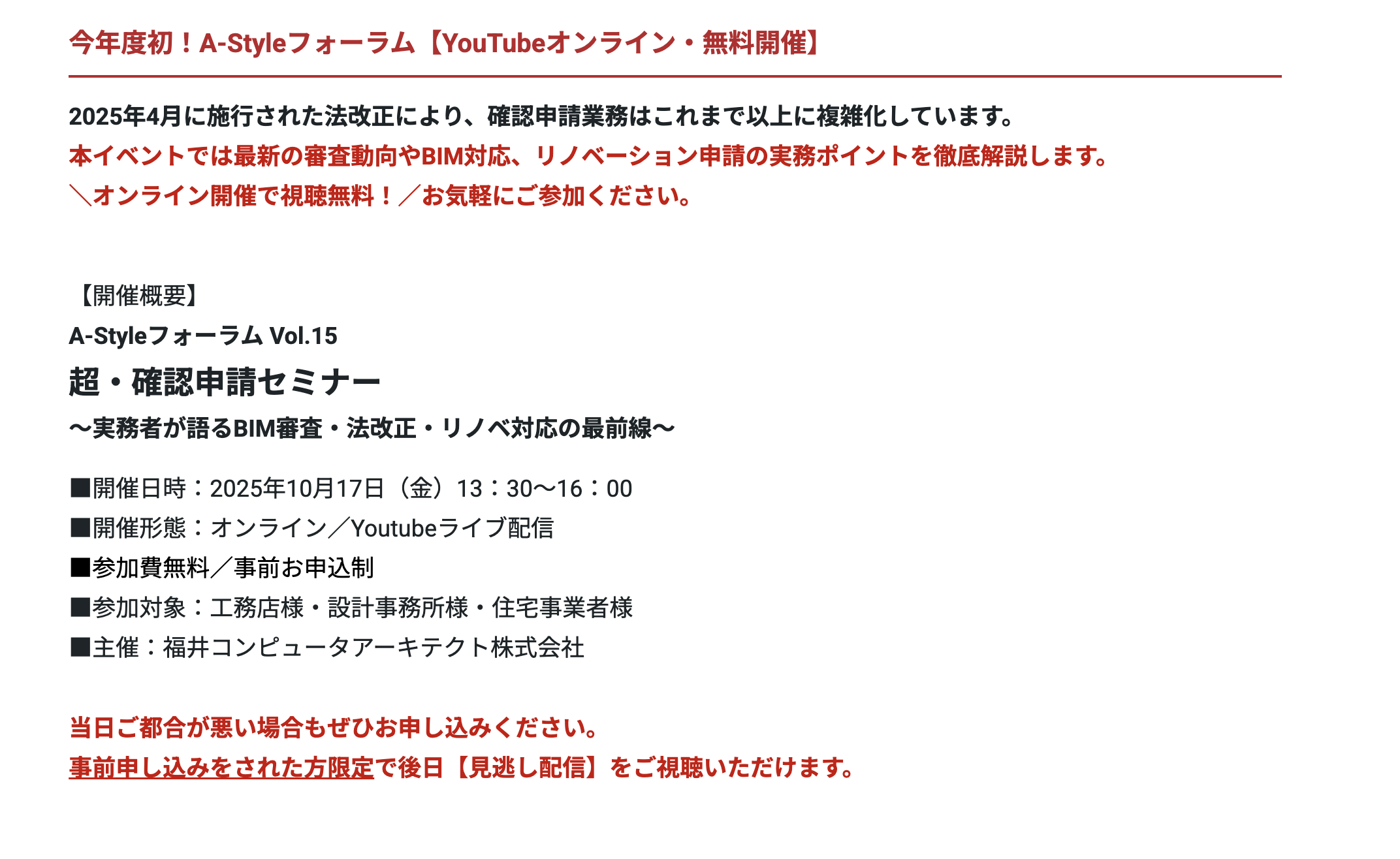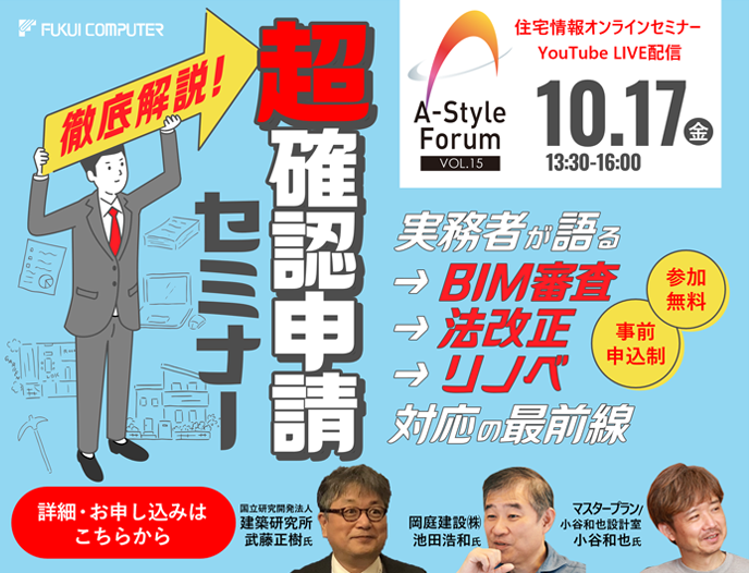 この度、10月17日(金)に開催される福井コンピュータアーキテクト株式会社主催の「A-Styleフォーラム Vol.15 超・確認申請セミナー」にて、講演させていただくことになりました。オンライン開催で、しかも無料でご視聴いただけますので、業界関係者の皆様はもちろん、これから家づくりやリノベーションをお考えの方にも、ぜひご参加いただければです。