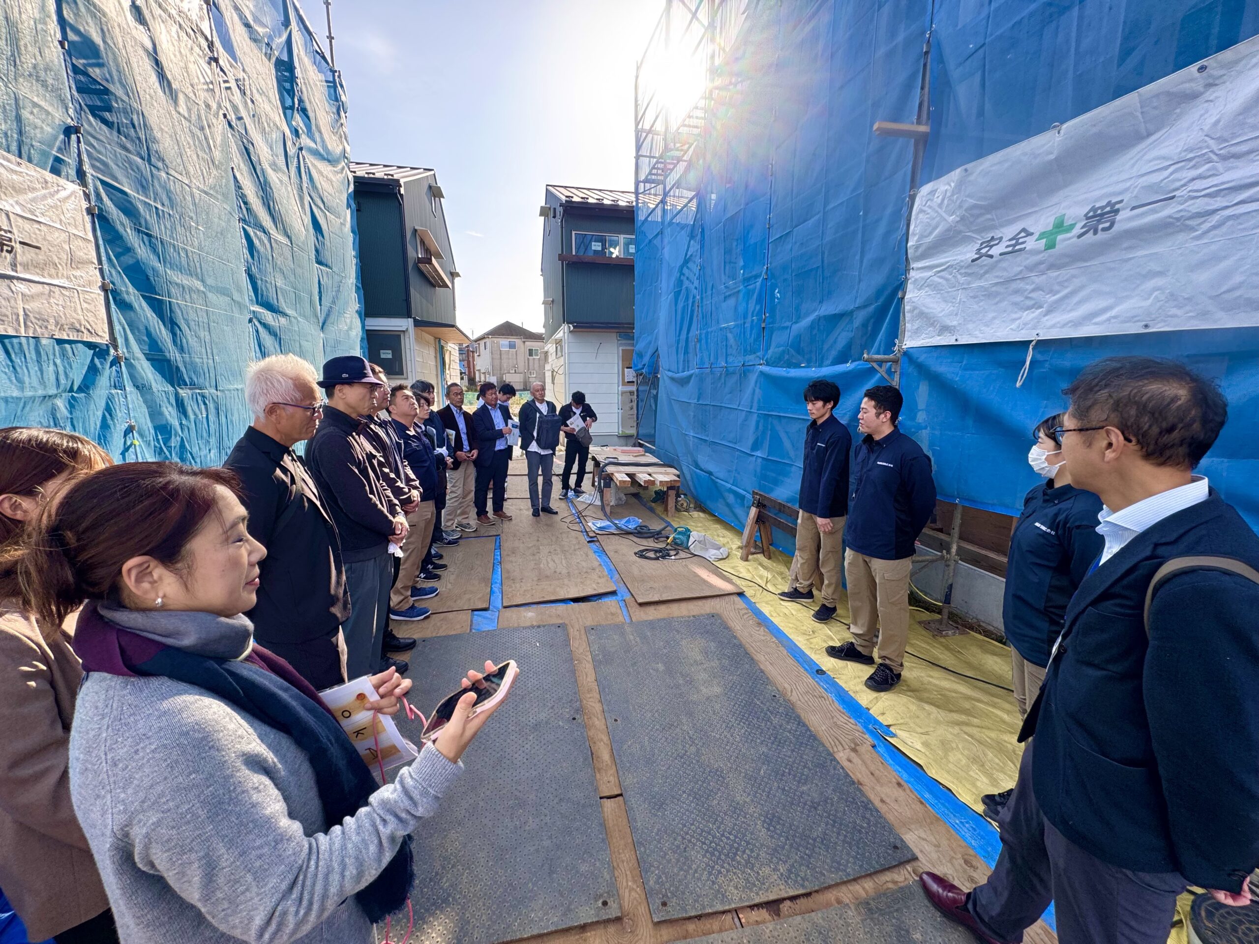 初日は、私ども岡庭建設と杉並区のハウステックスさんの会社・現場を視察していただきました。弊社では、現在進行中の「ゼロエミガルテン・ヤギサワ」の現場を見学いただきました(バス移動で)。実際に作業をしている社員大工たちに直接質問を投げかけていただき、若き大工たちの率直な想いや考え方を共有する時間となりました。「なぜ大工になろうと思ったのか」「訓練校での学びはどう現場で活きているのか」「将来どんな大工になりたいのか」参加者の皆さんからの質問に、緊張しながらも一生懸命答える若手大工たちの姿がありました。技術だけでなく、仕事に対する姿勢や誇りを持って働く姿を見ていただけたことは、私たちにとっても大きな励みでもあります。