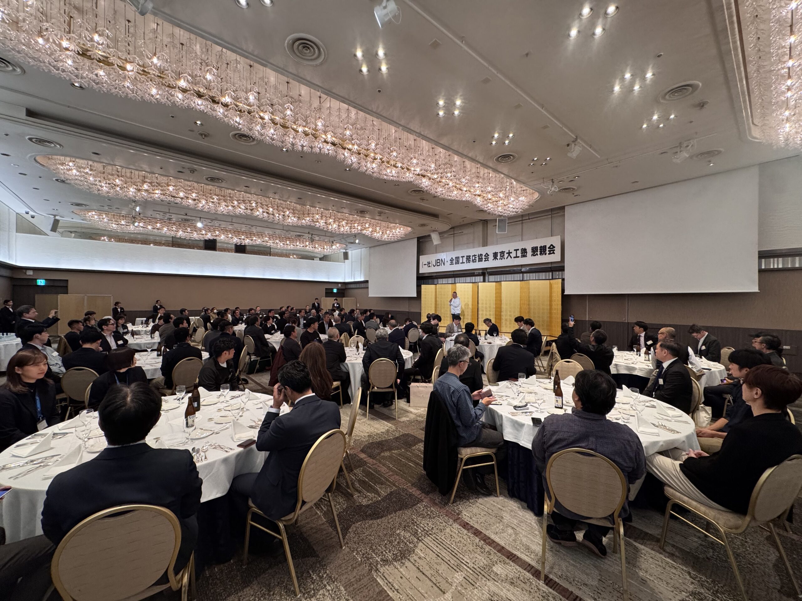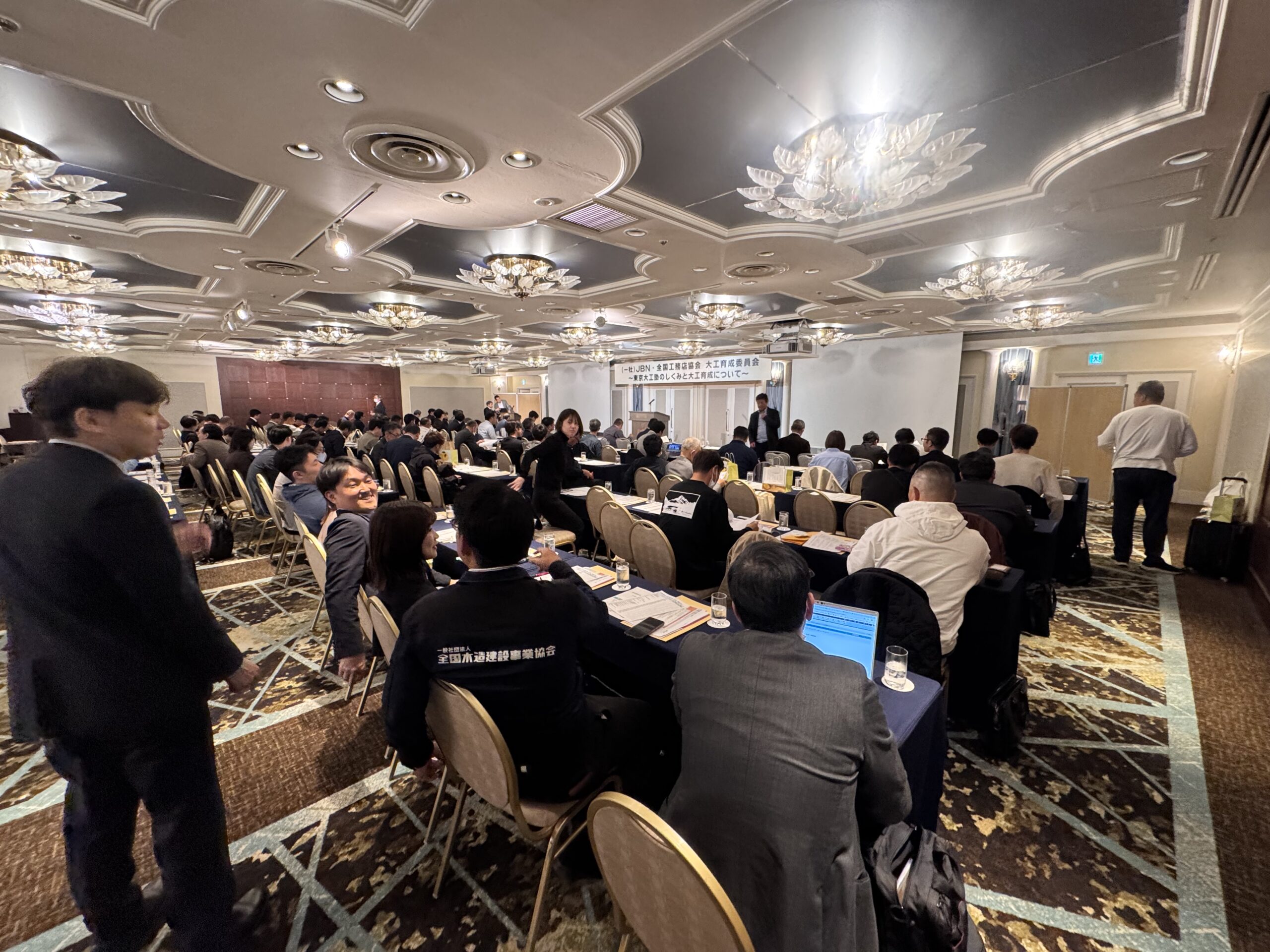 夜は、東京大工塾のメンバーも加わり、総勢120名ほどの大懇親会となりました。そして二次会へと社員大工と共にに続く長い夜…。全国各地の工務店が、それぞれの地域での取り組みや課題を語り合い、大工育成について熱く語る時間が続きました。北海道の厳しい冬場の対応、九州での若手確保の工夫、各地域特有の建築文化と技術の継承など、それぞれの地域性を踏まえた貴重な情報交換の場となりました。「同じ悩みを持つ仲間がいる」という安心感と、「こんな取り組みもあるのか」という新たな気づき。この両方を得られる時間こそが、こうした集まりの最大の価値でもあります。