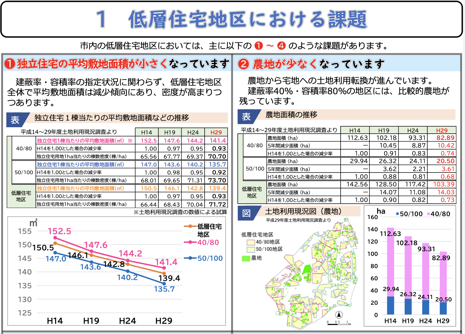 一方、農地等が多い地区については、農地や大規模空地が有する空間機能を活かしつつ、引き続きゆとりのある住環境を維持するため、見直しの対象としないという方針です。