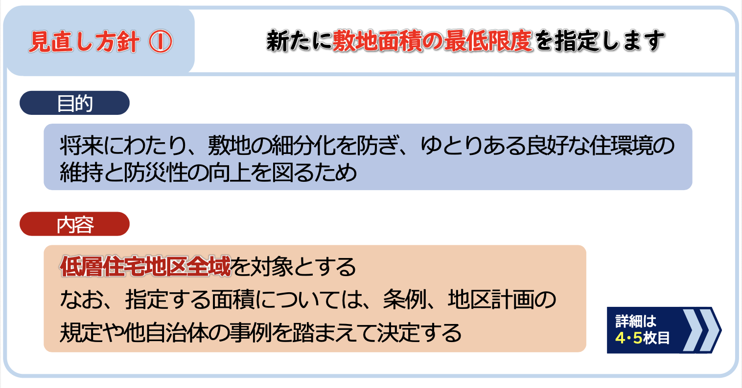 第一種・第二種低層住居専用地域の全域を対象に、敷地面積の最低限度が新たに指定されます。