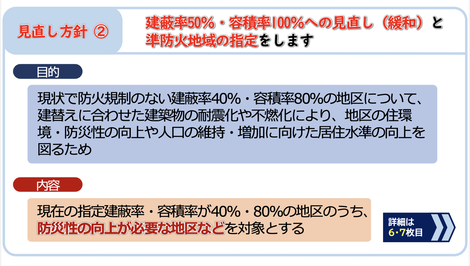 見直し方針② 建蔽率・容積率の見直しと準防火地域の指定