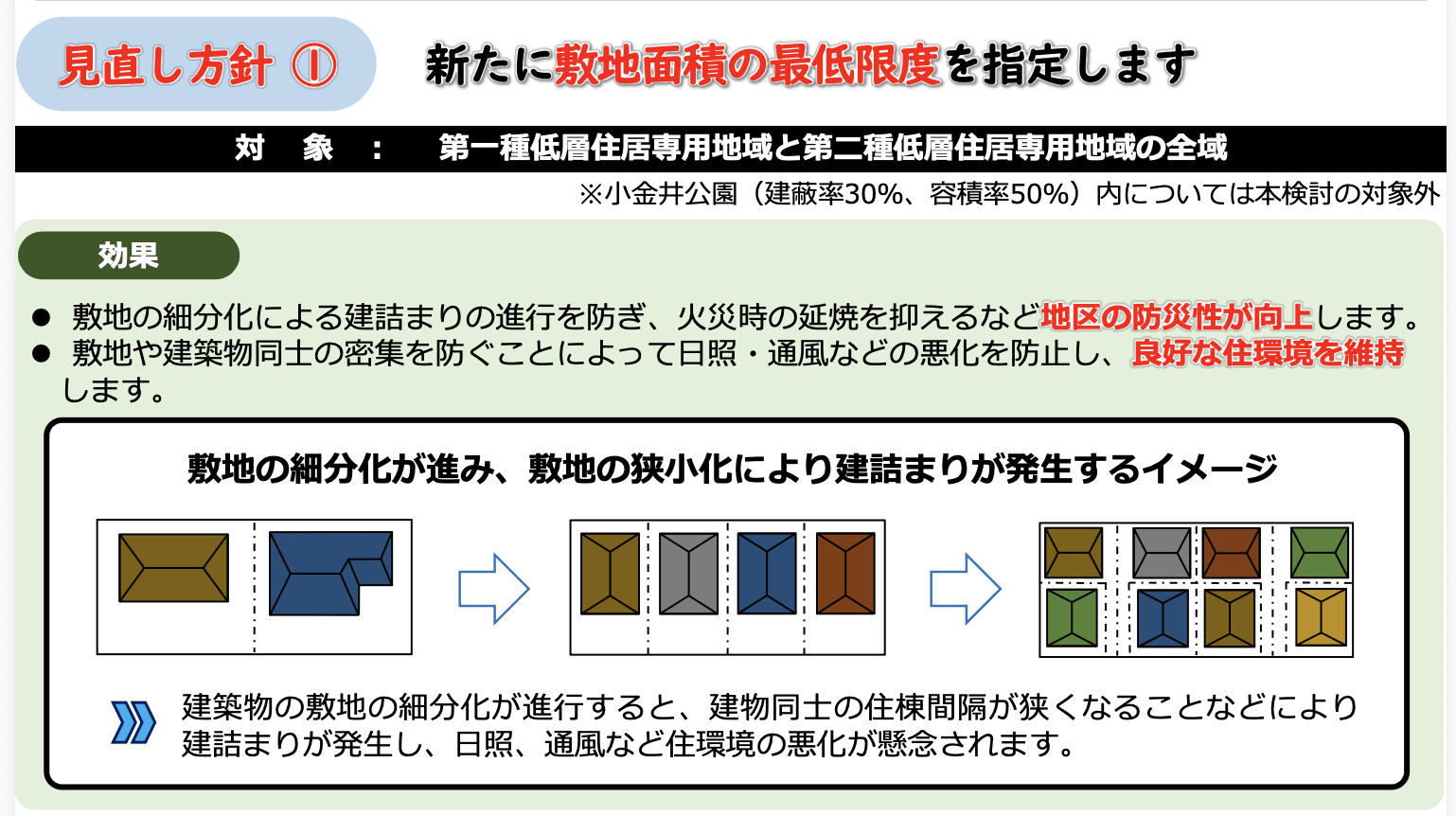 西東京市の用途地域見直しは、「敷地面積の最低限度の指定」と「建蔽率・容積率の見直し+準防火地域指定」という2つの柱で進められています。