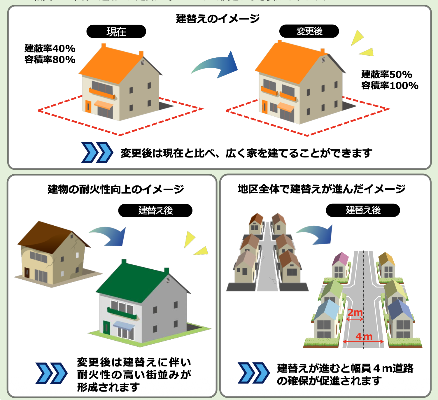 現在、建蔽率40%・容積率80%に指定されている地区のうち、防災性の向上が必要な地区などを対象に、建蔽率50%・容積率100%への見直し(緩和)と準防火地域の指定が行われます。