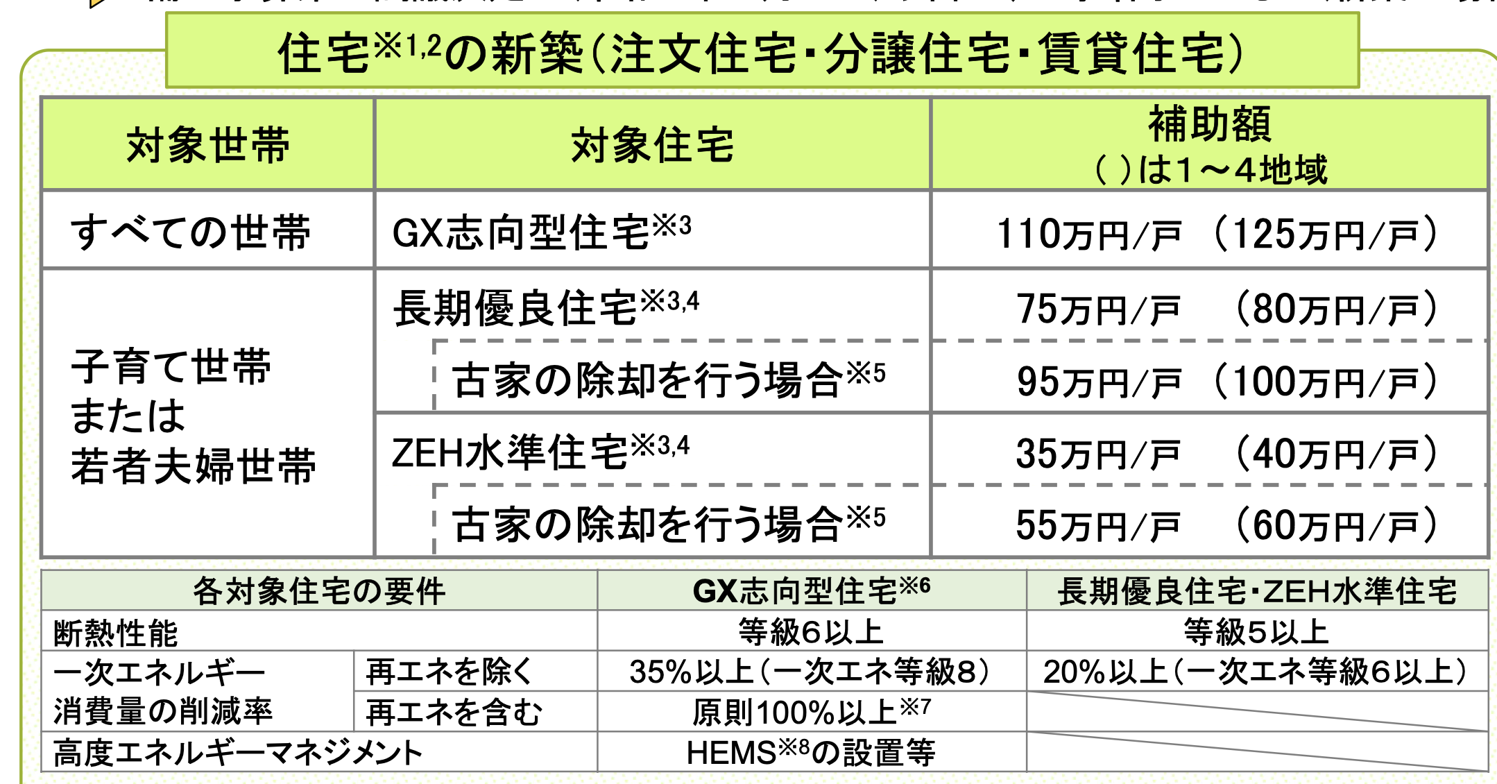 【GX志向型住宅】補助額:110万円/戸(寒冷地125万円) 最も高い性能基準で、断熱性能は等級6以上、再エネを除く一次エネルギー消費量を35%以上削減(一次エネ等級8)することが求められます。さらに、HEMS(ホームエネルギーマネジメントシステム)の設置など、高度なエネルギーマネジメントが必要です。
