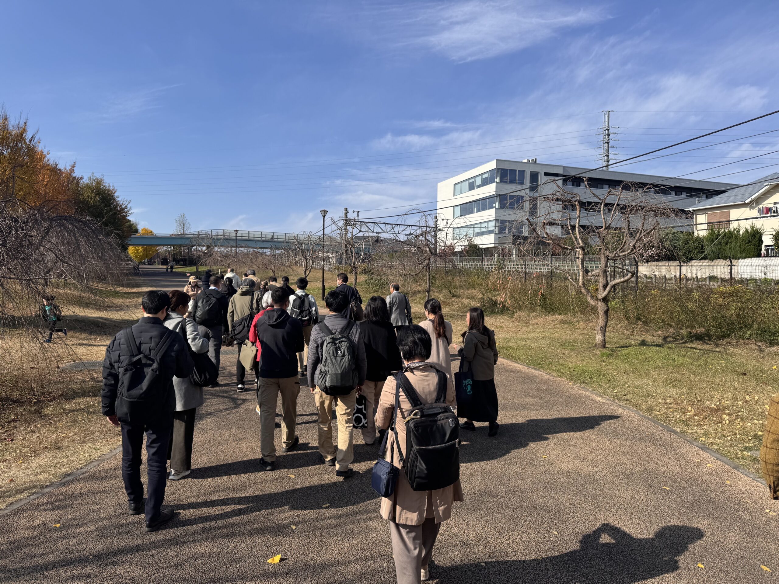 説明会の後、全社員で徒歩により最寄りの都立東伏見公園へ避難訓練を実施しました。実際に歩いてみることで、避難経路の確認はもちろん、避難にかかる時間、途中の危険箇所、集合場所の状況など、地図上では分からない多くのことが見えてきます。また、公園に集まろうといっても公園も広く、いざというときにために、ピンポイントで「有事の際は、ここで集まろう!」と決めました。