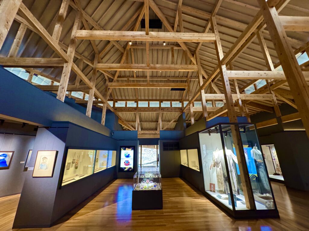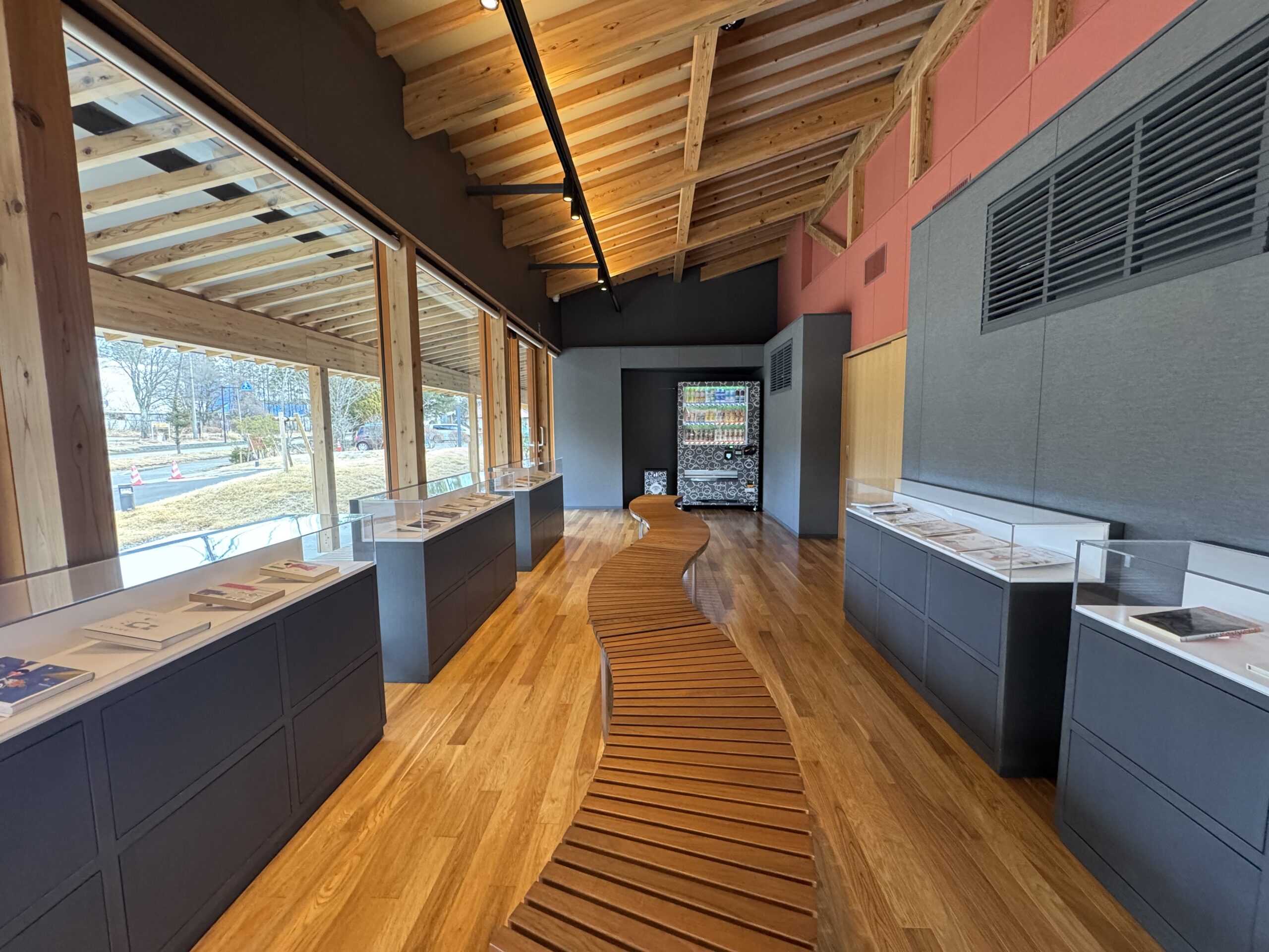 まず館内に入って感じたのは、木造建築の持つ温もりと力強さ。この建物は木造・一部鉄骨造、2階建て。構造架構が非常に丁寧に表現されていて、梁や柱の力の流れが目で見えるよう。大がかりな建築でありながら、内藤氏が意図したのは「大工さんが作るような在来工法」を起点にした設計だそうです。まさにそれが全身で伝わってくる空間でした。