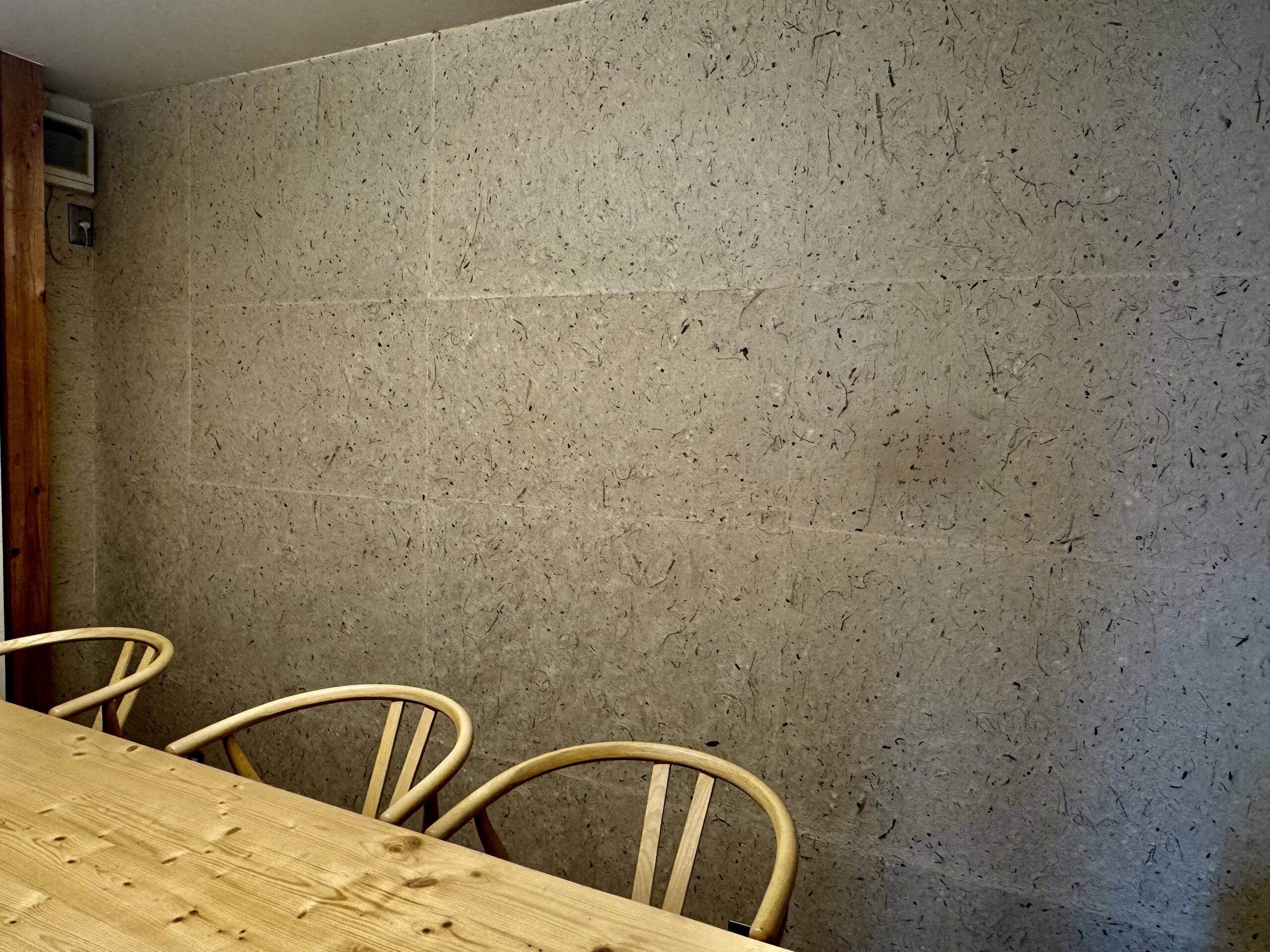 今回取り寄せたサンプルと和紙の一部を、まずは本社の会議室に貼ってみることにしました。実際に貼ってみて感じるのは、空間の表情がガラリと変わること。素材感のある壁面は、それだけで場の雰囲気を温かく豊かにしてくれます。