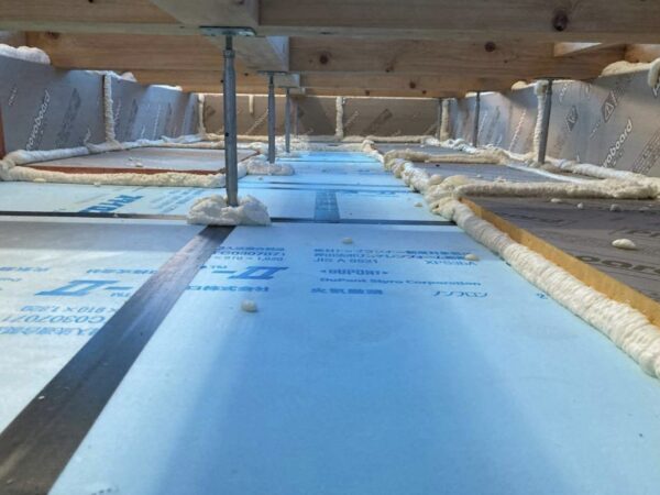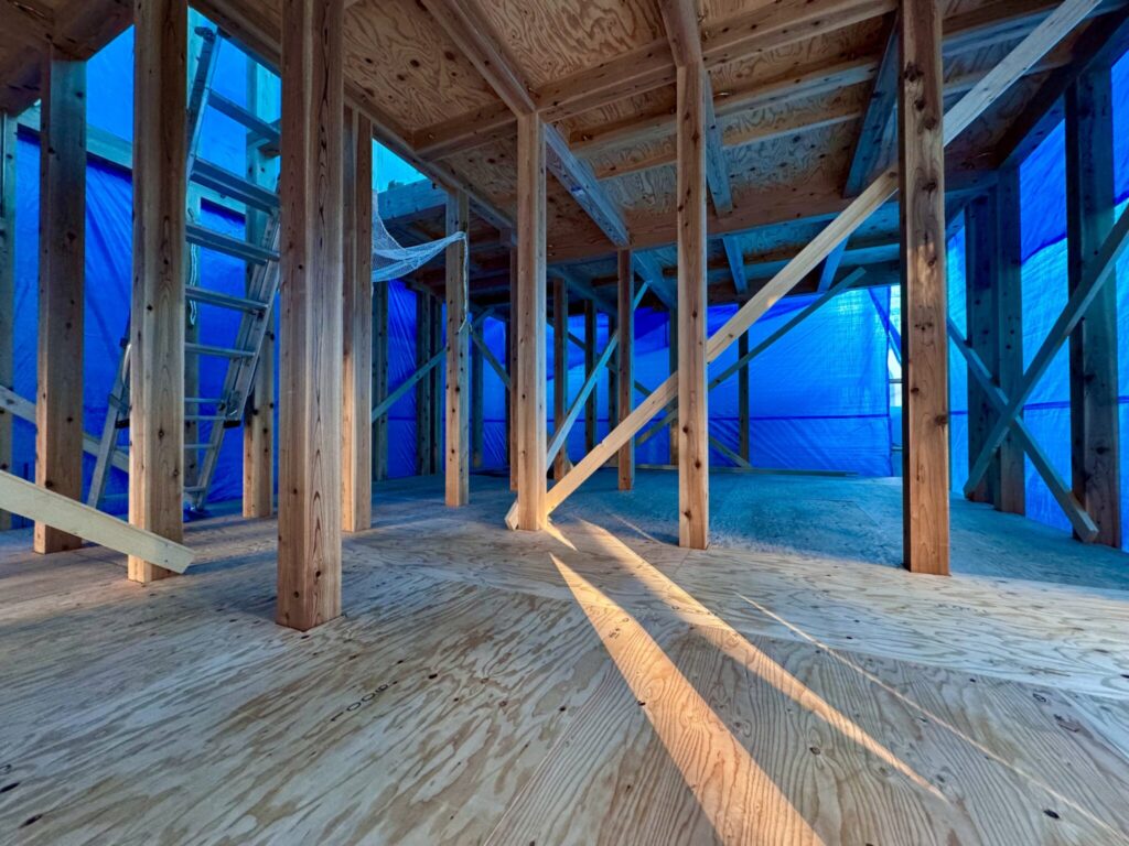 当たり前のようで、当たり前でない雨養生。このブルーシートのシーンを町中で見かけたら「おかにわ」の家造りが進行中かもしれません。