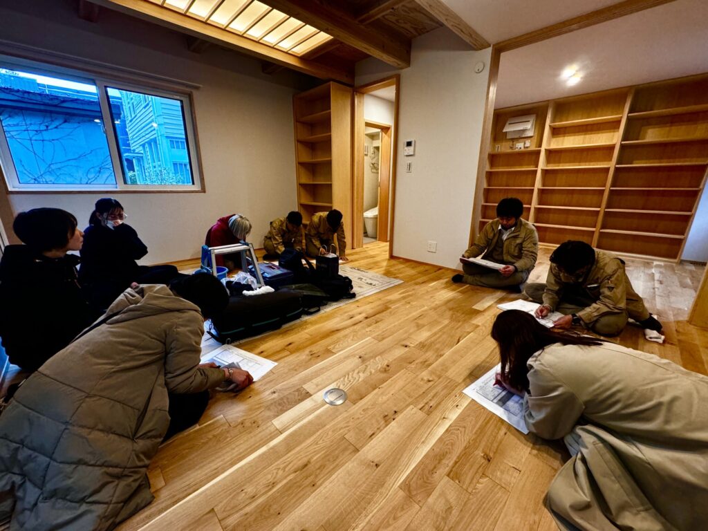 私たちは、すべての現場で「社内検査」を行っています。これは、建物が完成する際に、設計担当や現場監督、大工さんなど、チーム全員で建物をチェックする大切な工程です。