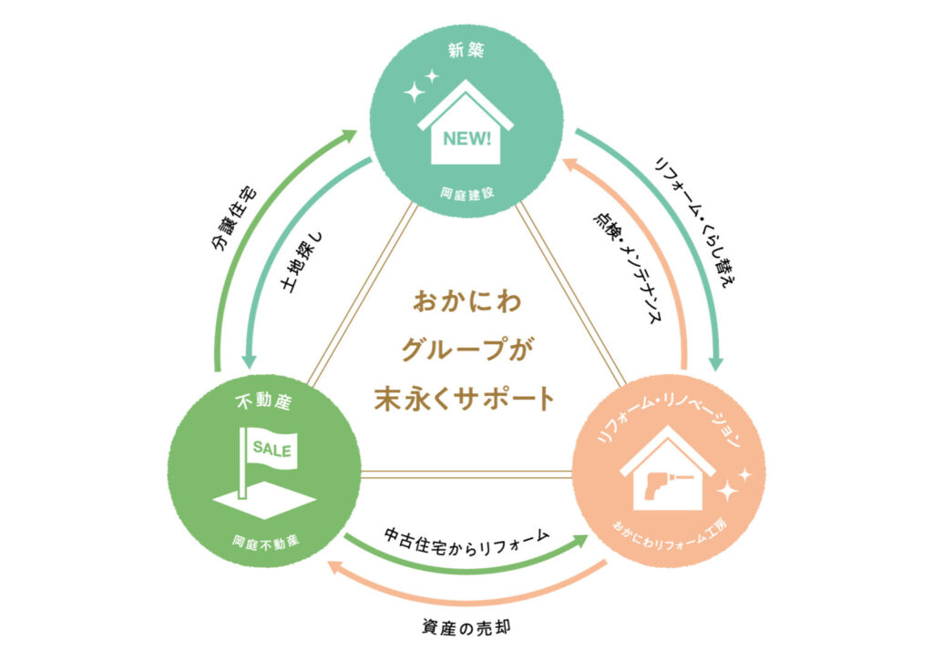 グループ内には、設計・施工の「岡庭建設」、不動産の専門家である「岡庭不動産」、管理部門の「おかにわ賃貸」メンテナンスを担う「おかにわリフォーム工房」がおり、それぞれが専門性を発揮しながら連携し、オーナー様の資産活用を強力にサポートします。