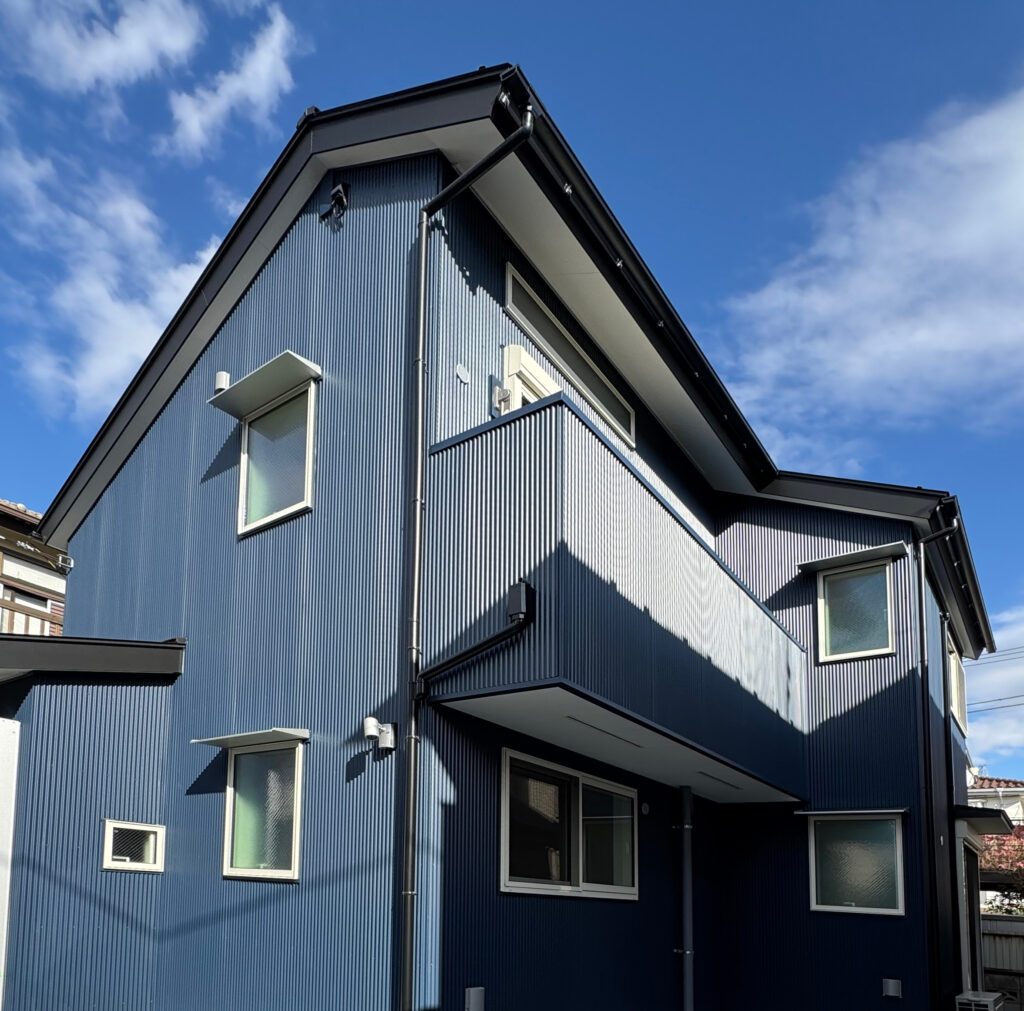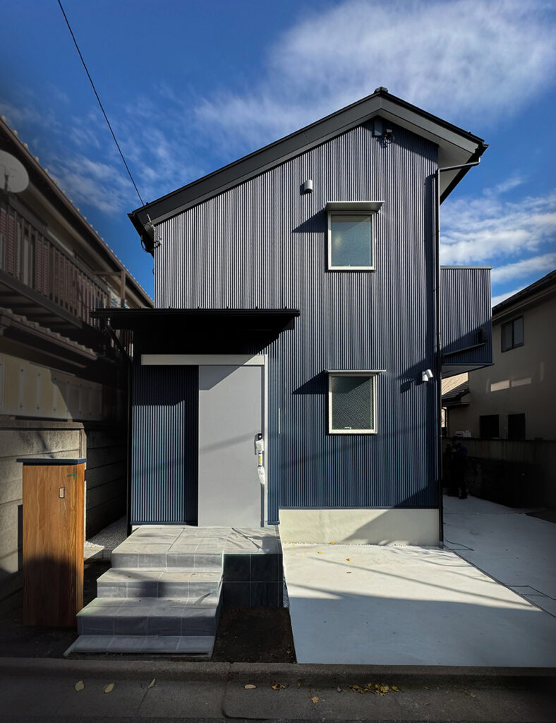 外壁仕上げは、シンプルかつ軽くて丈夫、錆びにくく美しい、メンテナンス性も抜群な万能素材であるガルバリウム鋼板。色は人気のネイビー色。