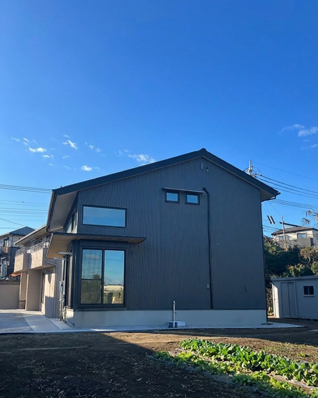 この度、お施主様のご厚意によりお披露目するのは、敷地面積約54坪に建つ2階建てのお住まいです。東側に広がる畑とのつながりを意識し、光の入り方や角度まで丁寧に計算した配置により、明るく開放的な空間を実現しました。外観にはギングロのガルバリウム鋼板・丸波を採用し、落ち着きのある重厚感を演出しています。ハウスネーム「いこいのいえ」は、吹き抜け越しに畑を望める、心安らぐ居場所から着想しました。