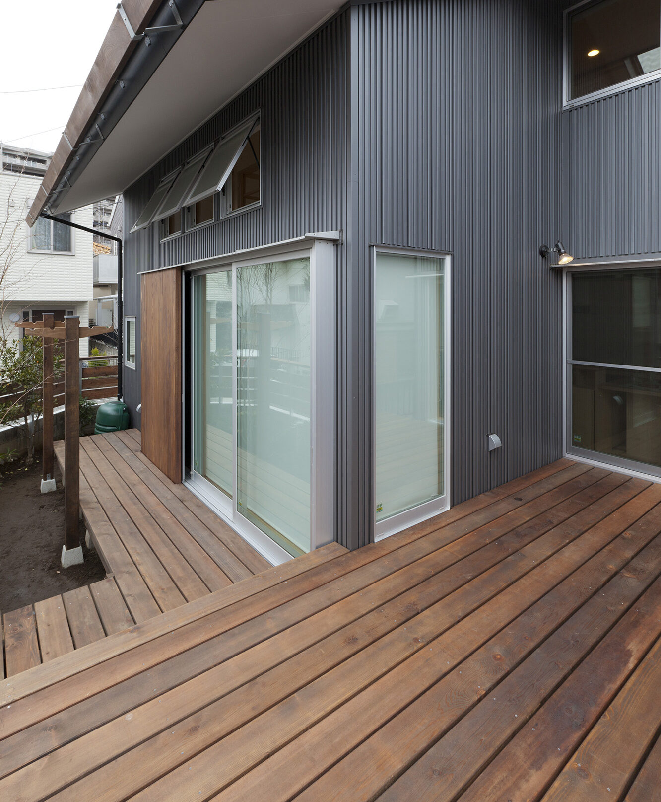 この度、お施主様のご厚意によりお披露目するのは、武蔵野の閑静な住宅街に、住まい手のこだわりが凝縮された一軒家。敷地面積約35坪に建つ2階建てのお住まいです。外観は外壁は木などと融合させ色合いのダークグレーのガルバリウム鋼板・角波を採用しています。