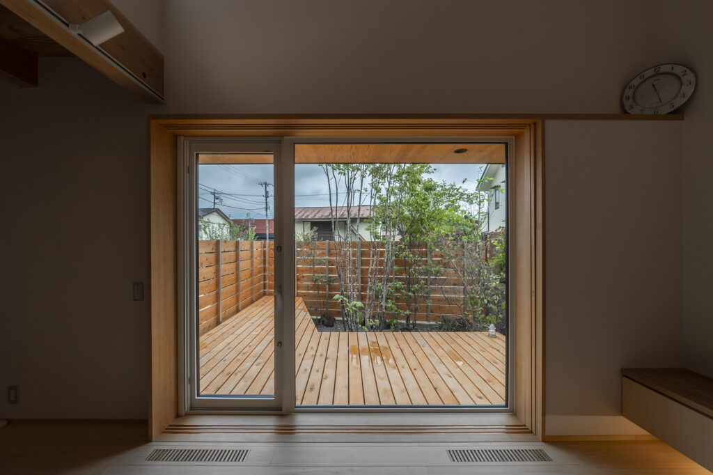 リビングからフラットに繋がる広々としたデッキは、屋外でありながら「第二のリビング」として日常に開放感をもたらします。周囲を木塀で囲むことで、開放感とプライバシー保護を両立。周囲の視線を気にすることなく、家族でゆったりと過ごせるプライベートな外空間が完成しました。