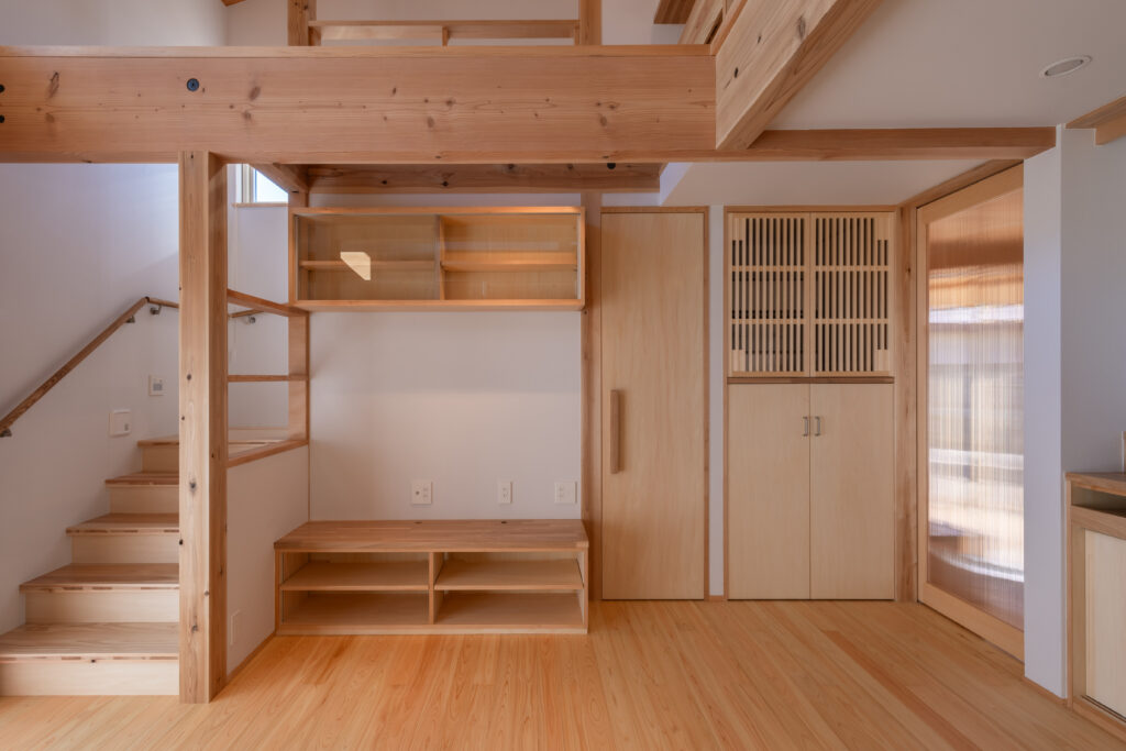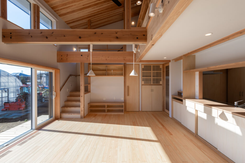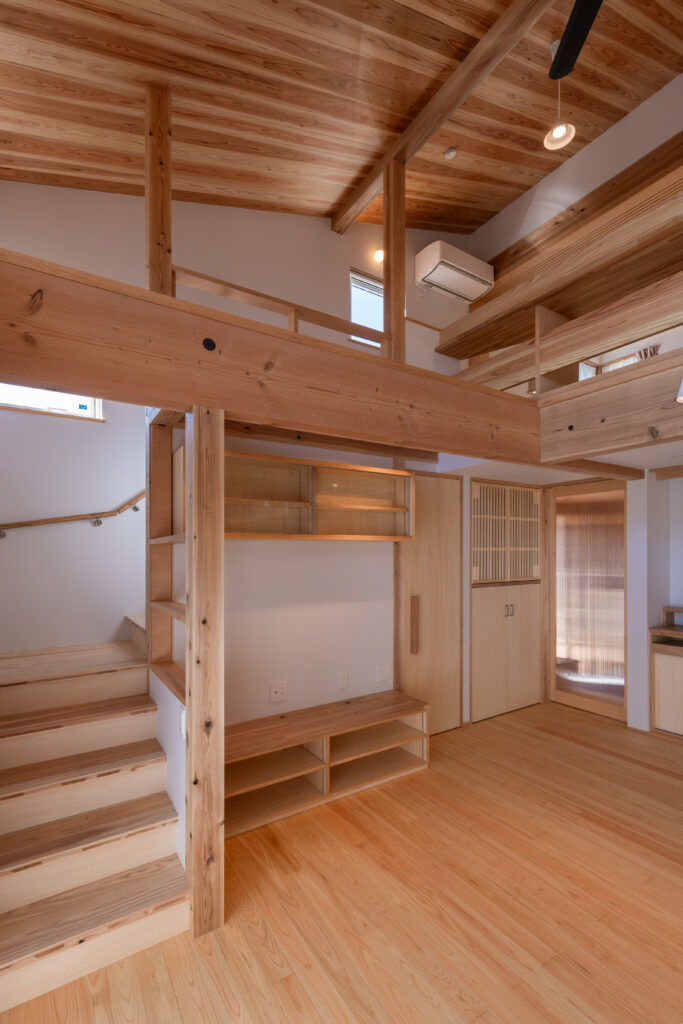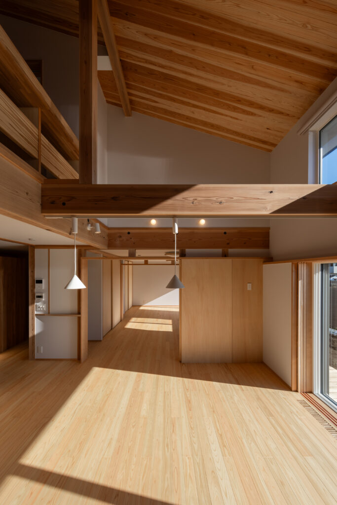 LDKの扉を開けると、ダイナミックな吹き抜けと、杉や桧(ひのき)など国産材の豊潤な香りが迎えてくれます。床だけでなく、勾配天井や力強い梁にも無垢材をふんだんに使用し、まるで森の中にいるかのように心も体も癒やされる空間となりました。 大きな吹き抜けは、1階と小屋裏スペースをゆるやかにつなぐ役割も果たします。どこにいても家族の気配を感じられる、心地よい一体感が生まれます。