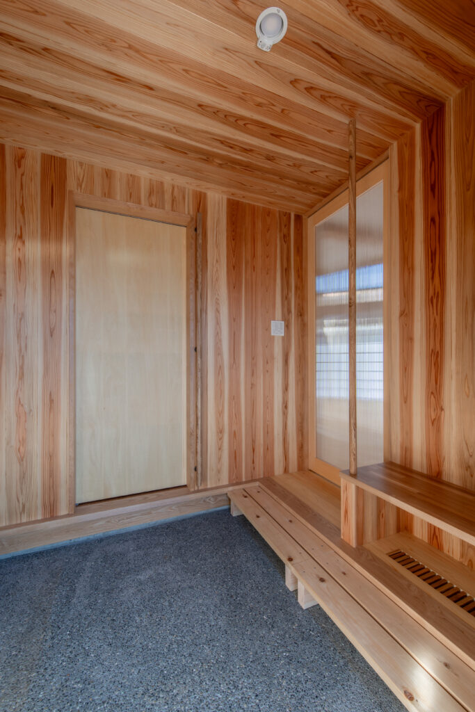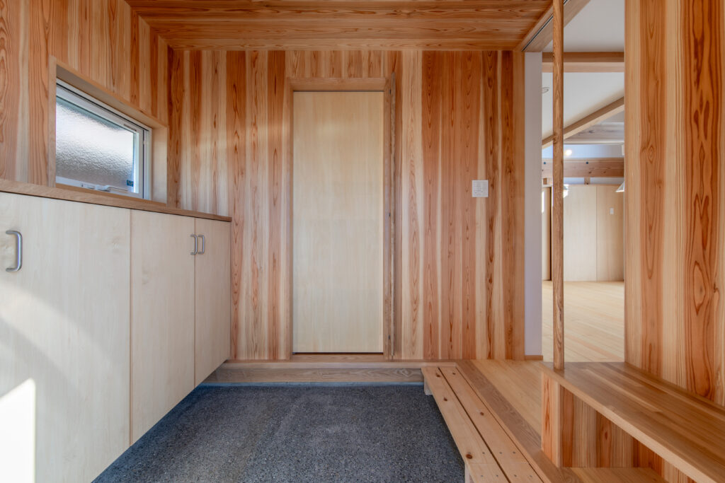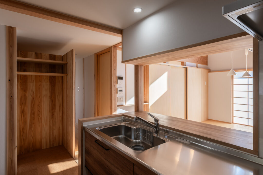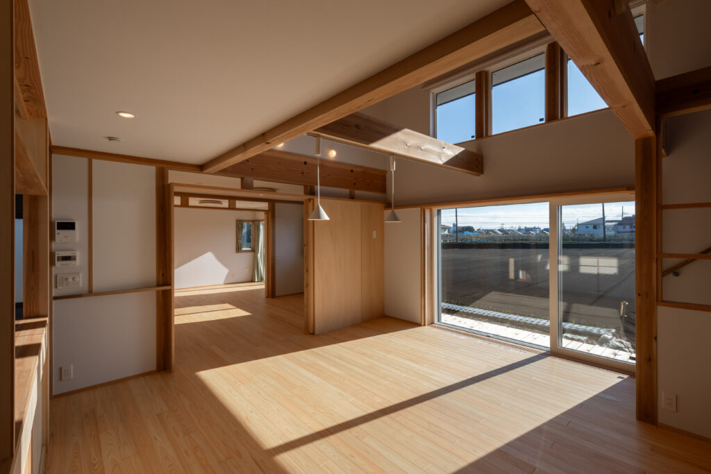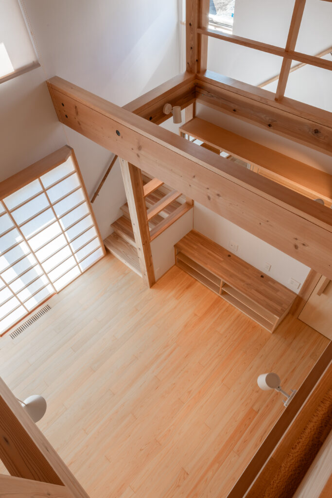 LDKの扉を開けると、ダイナミックな吹き抜けと、杉や桧(ひのき)など国産材の豊潤な香りが迎えてくれます。床だけでなく、勾配天井や力強い梁にも無垢材をふんだんに使用し、まるで森の中にいるかのように心も体も癒やされる空間となりました。 大きな吹き抜けは、1階と小屋裏スペースをゆるやかにつなぐ役割も果たします。どこにいても家族の気配を感じられる、心地よい一体感が生まれます。