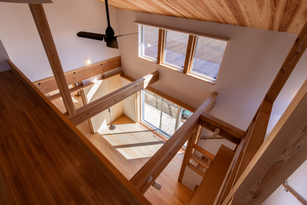 国産材の香りに包まれる、開放的な吹き抜けリビング