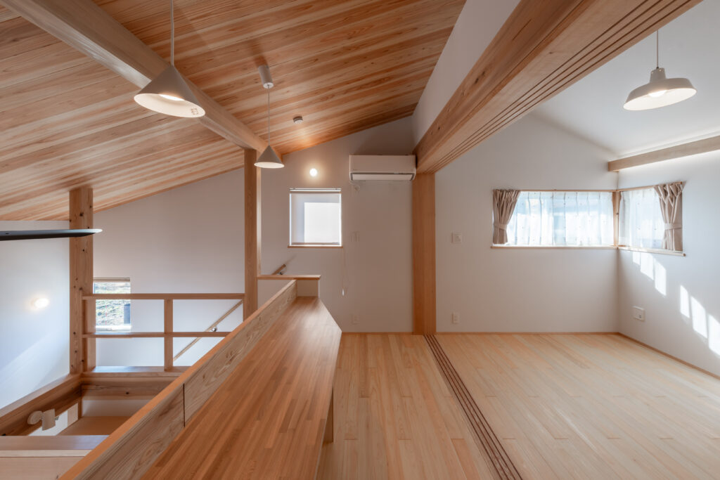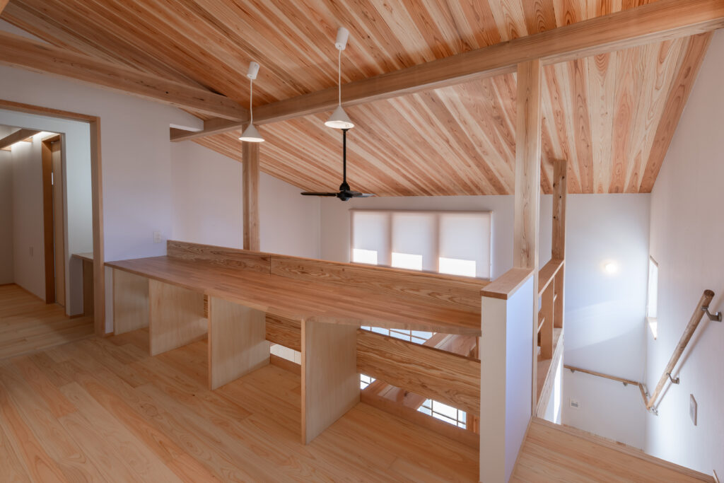 小屋裏は、書斎や趣味の部屋など、多目的に使えるボーナススペース。吹き抜けに面して設えた長い造作カウンターは、景色を眺めながら仕事や勉強ができる特等席です。