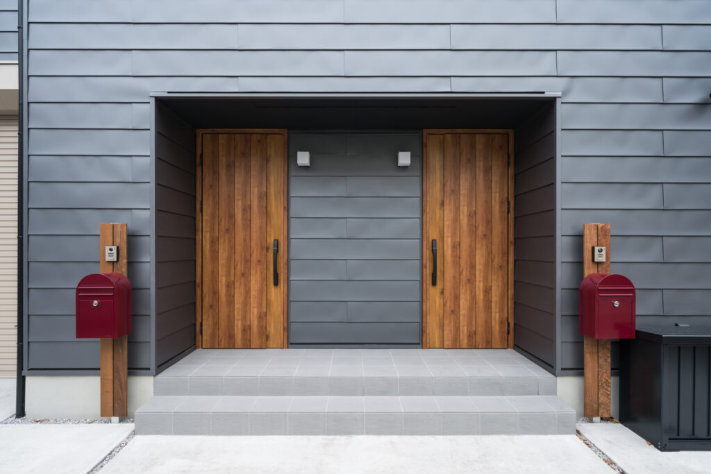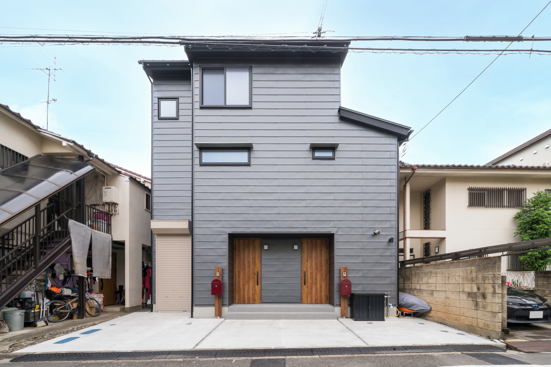 外観デザイン: 外壁には耐久性の高いガルバリウム鋼板の「平葺き仕上げ」を採用。ギングロ色の洗練されたフラットな表情は、街並みに美しく調和します。