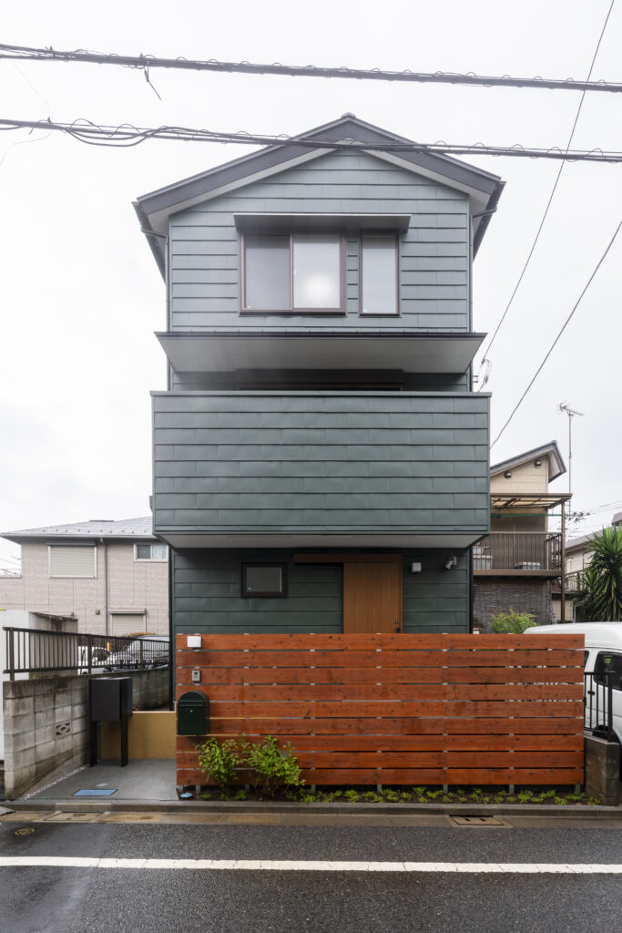 敷地25坪の都市部で叶えた、準耐火構造の木造3階建て。「三織のいえ」は、光と風を採り込む設計とモスグリーンの外観が魅力。火災に強い安心の構造と、家族の温かな居心地を丁寧に織りなす住まいです。