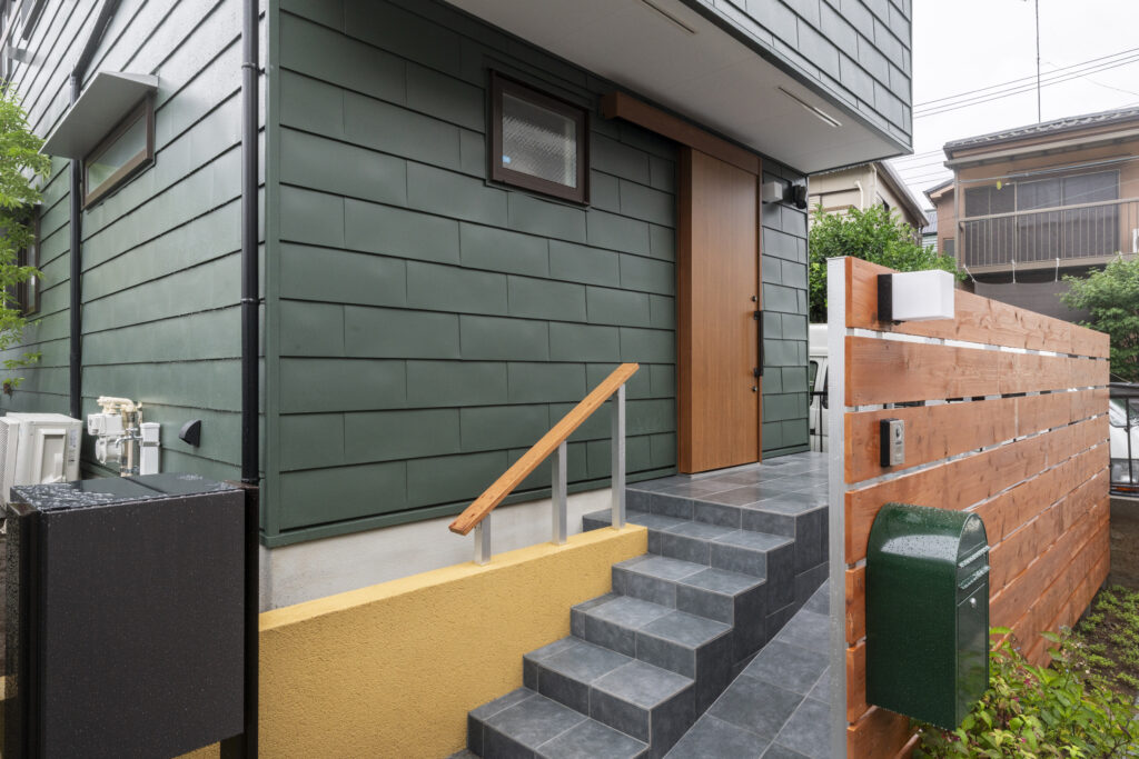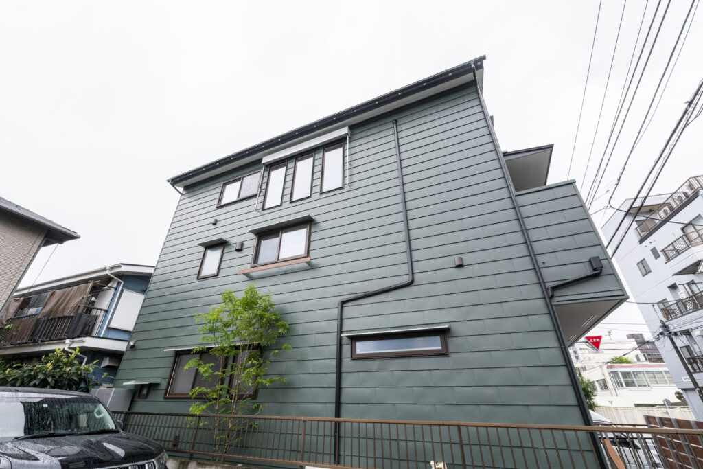 街並みに映えるモスグリーンのガルバリウム平葺き外壁が、上質で落ち着いた印象を与えます。