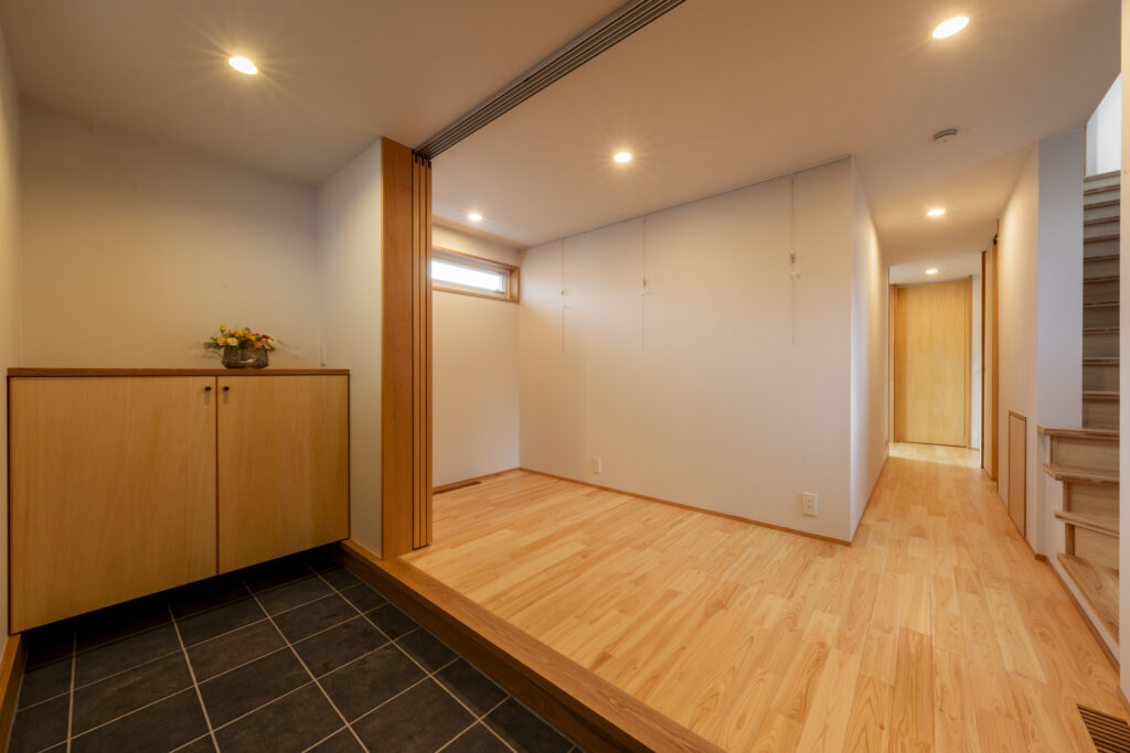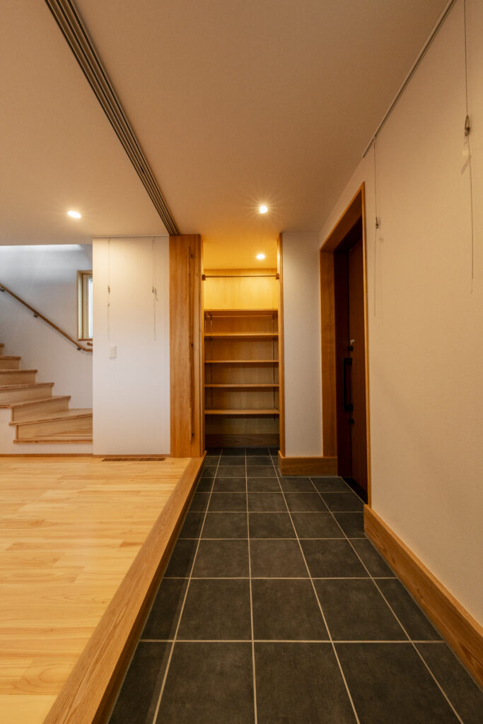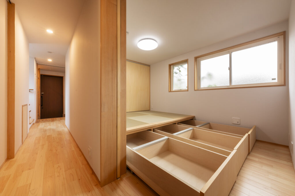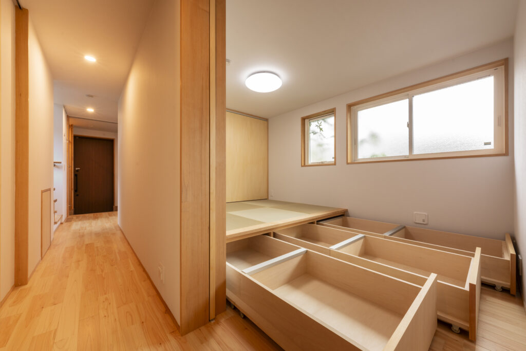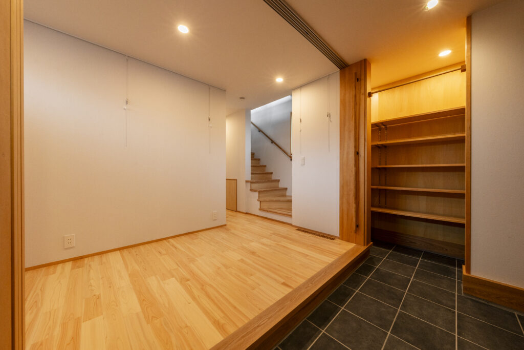 広々とした土間玄関が出迎える1階。 大容量の引き出し収納を備えた小上がり空間で、日用品や季節物もすっきり収まります。 日々の暮らしが自然と整う、収納力に優れたフロアです。