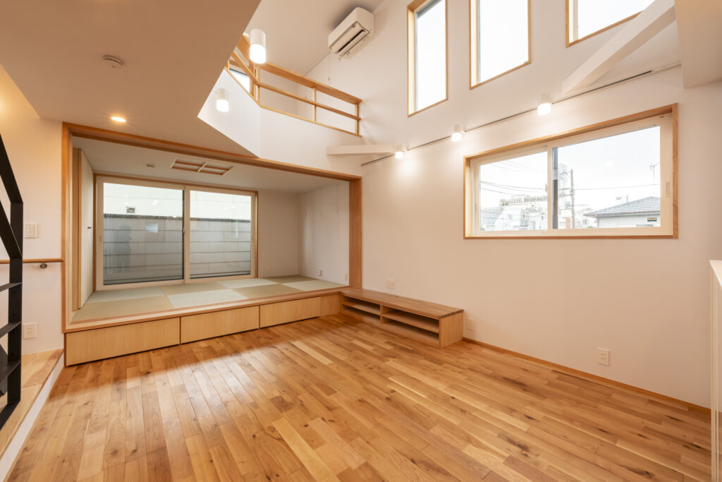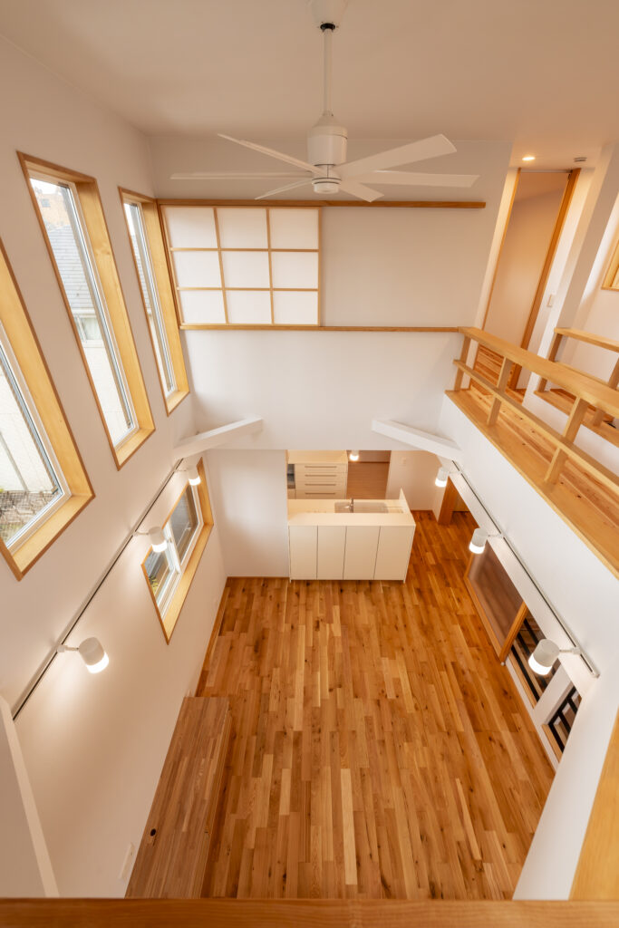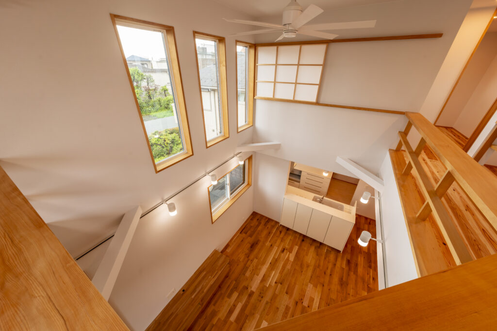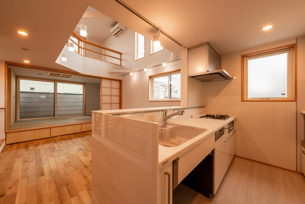 LDKは2階に配置し、吹き抜けと和室を一体化。 三方向の窓から光と風を取り込むパッシブデザインにより、キッチンに立つ時間も心地よく感じられます。