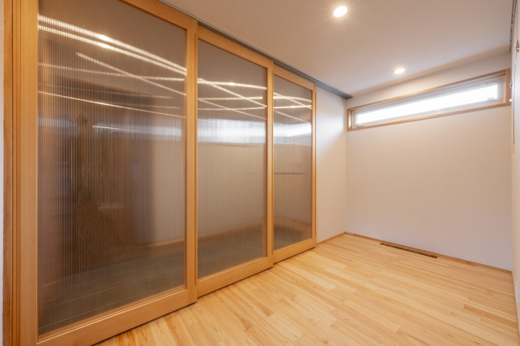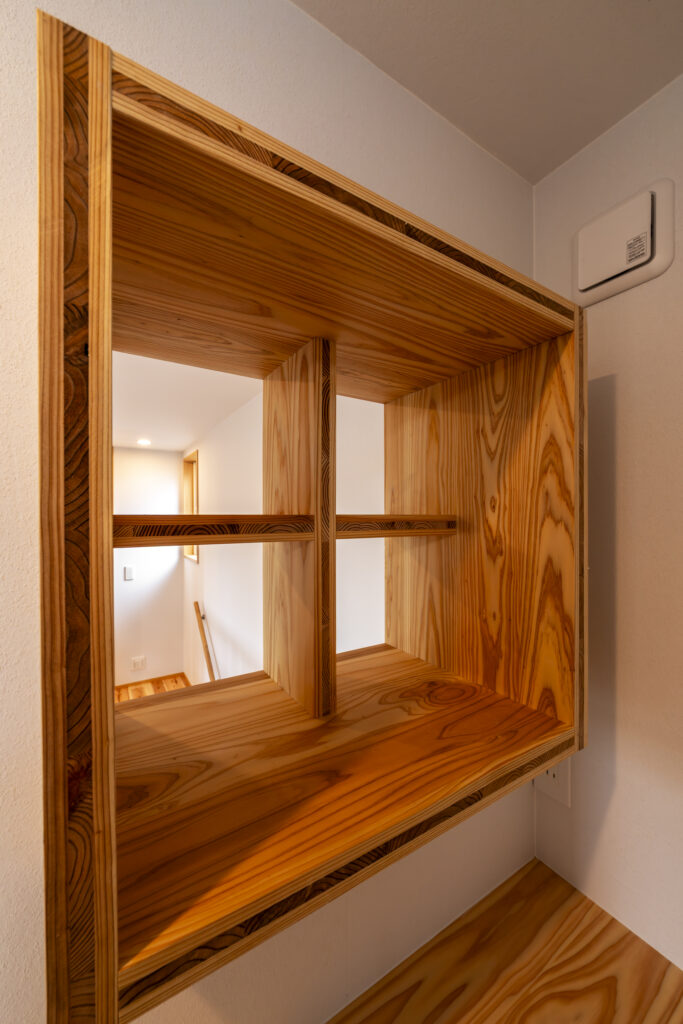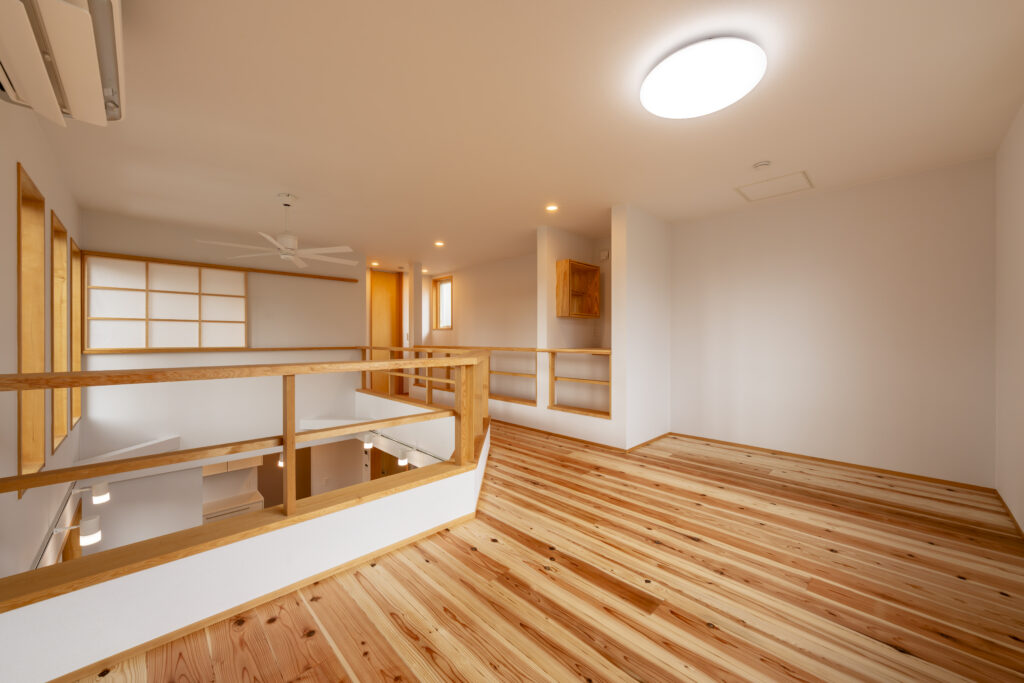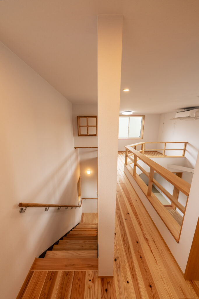 3階には寝室や個室のほか、階段上の小さなおこもりスペースを設置。 読書や趣味の時間にぴったりの、隠れ家のような場所です。 階段は段差を緩やかにし、2〜3階はスリムな鉄骨階段で軽やかな印象に。 準耐火構造による安心感に加え、高断熱・高気密仕様で、一年を通して素足が心地よい室内環境を保ちます。