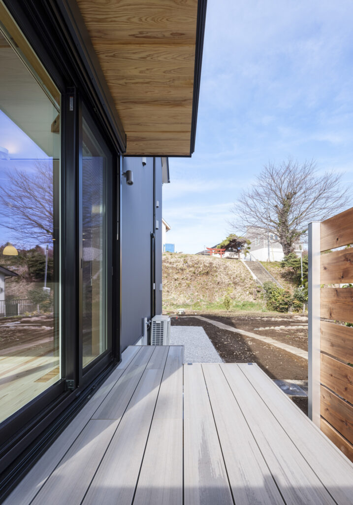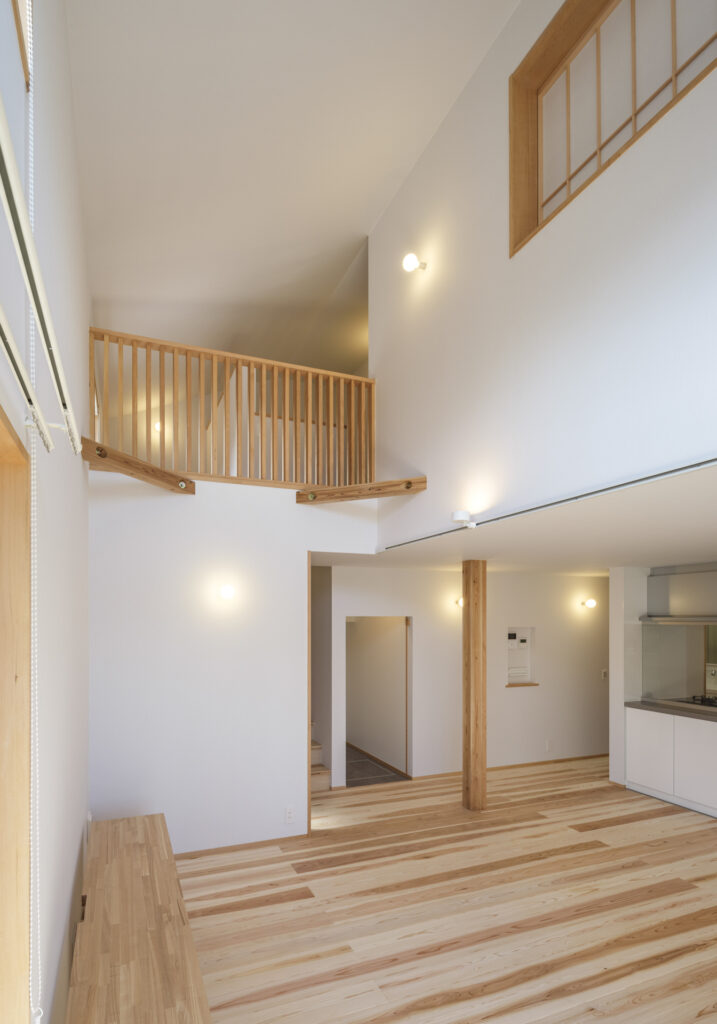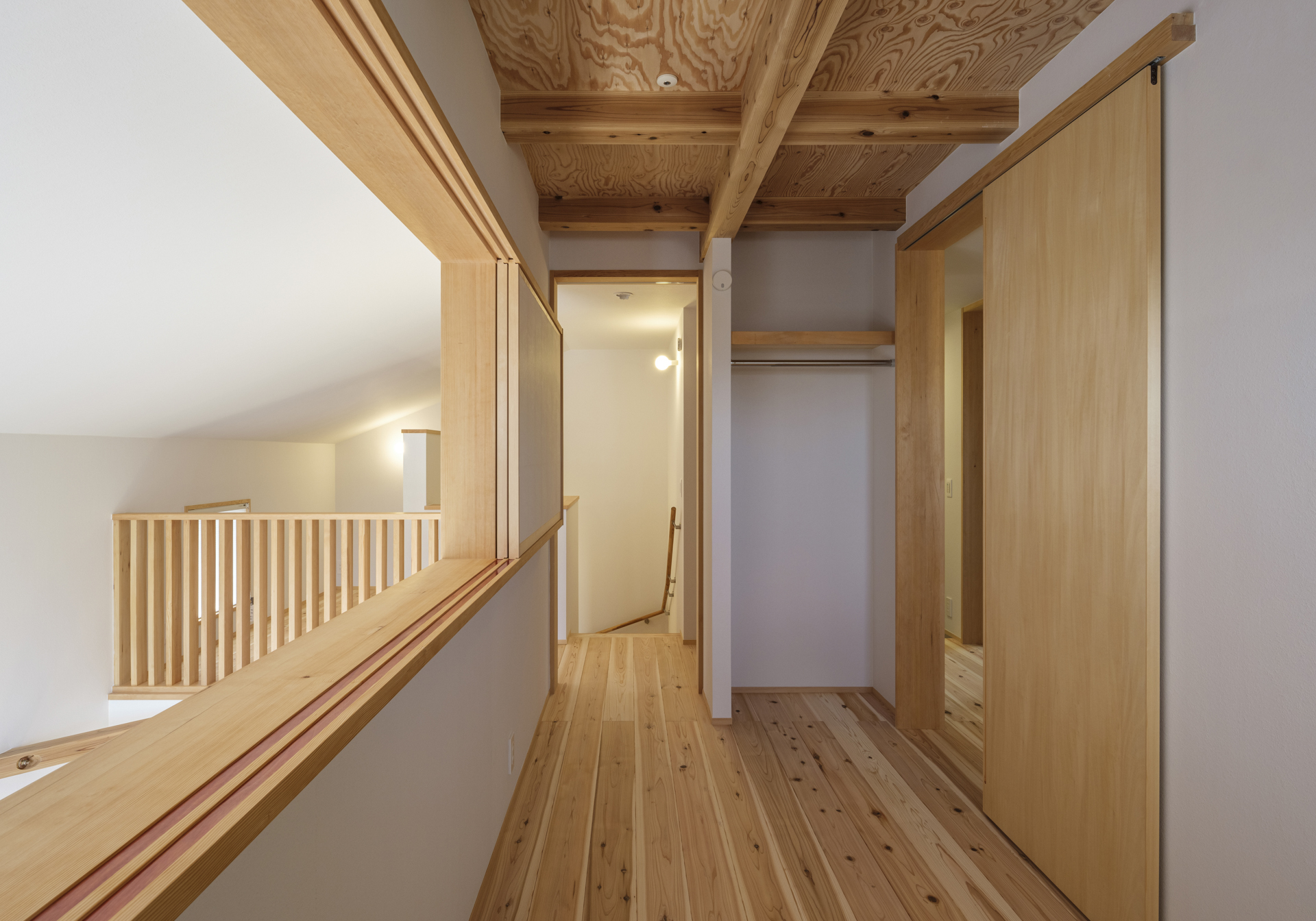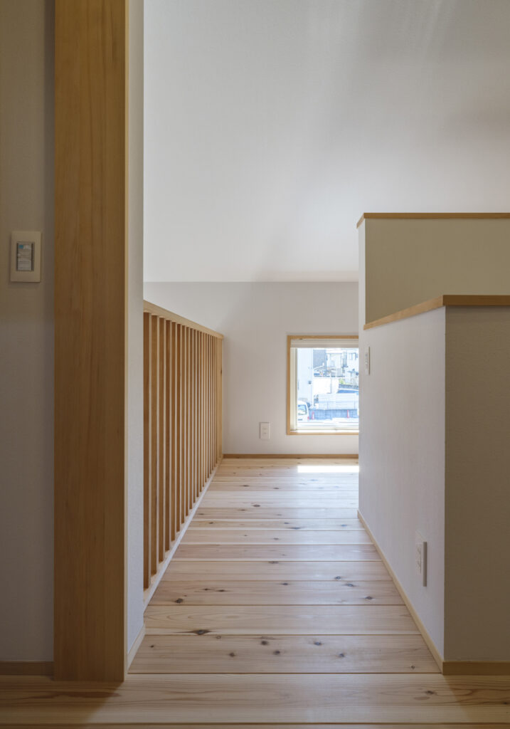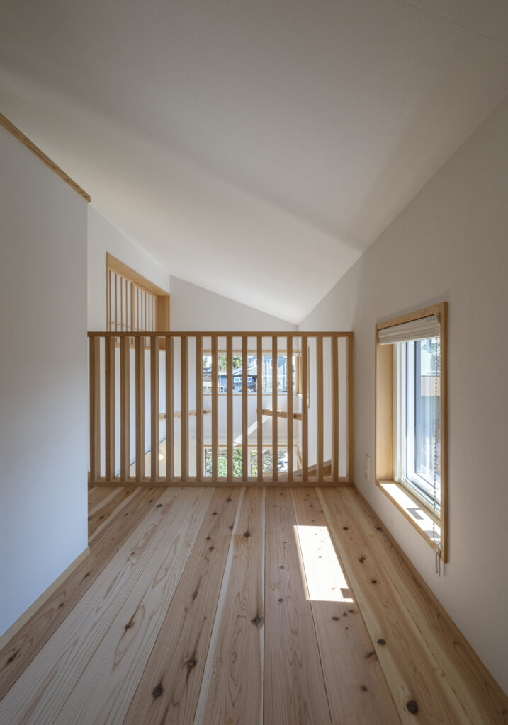 東側に広がる畑とのつながりを意識し、光の入り方や角度まで丁寧に計算した配置により、明るく開放的な空間を実現しました。外観にはギングロのガルバリウム鋼板・丸波を採用し、落ち着きのある重厚感を演出しています。ハウスネーム「いこいのいえ」は、吹き抜け越しに畑を望める、心安らぐ居場所から着想しました。