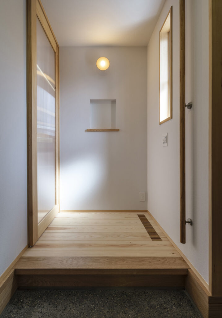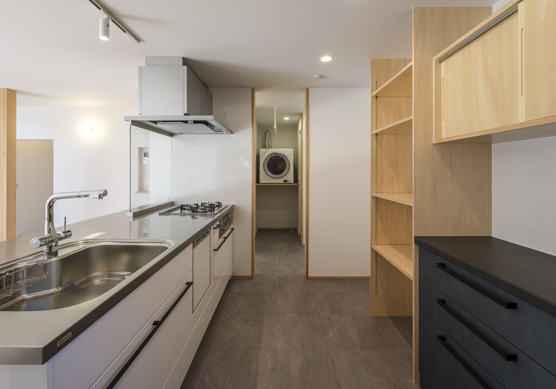 毎日の家事が少しでも心地よく、無理なく進むように、水回りは動線を重視して計画しました。キッチンを起点に、洗面・トイレ・脱衣所へとぐるりと回遊できる配置とすることで、朝の身支度や家事が重なりがちな時間帯もスムーズに。