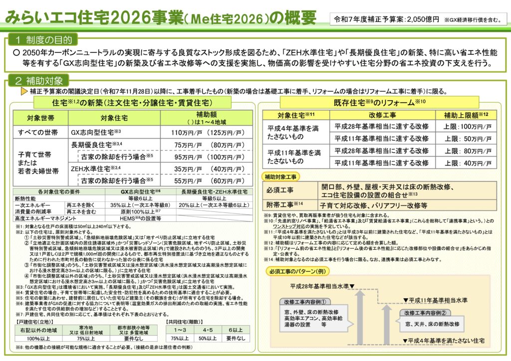 皆さん、こんにちは!IKEDA隊長です。本日は、最新ニュースのお知らせです。 令和7年度補正予算案で、住宅の省エネ化を支援する新しい補助金制度「みらいエコ住宅2026事業(Me住宅2026)」が発表されました。総額2,050億円という大規模な予算が組まれたこの制度、2050年カーボンニュートラルの実現に向けた重要な施策として位置づけられています。今回は、この制度の内容と、私たち岡庭建設の住宅を含めお伝えいたします。