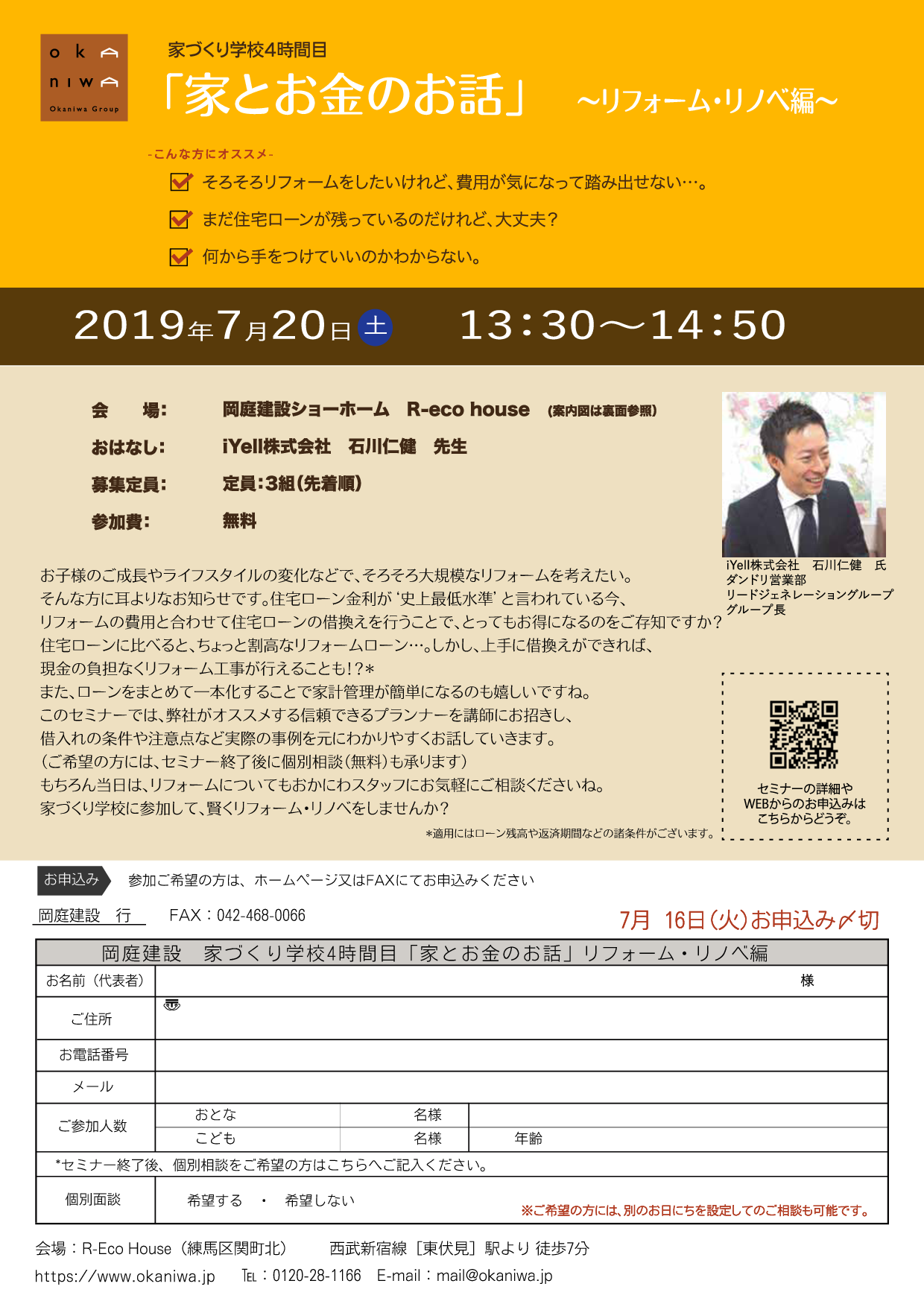 住宅を所得された方の大半は「住宅ローン」を利用しているかと思います。 その上で30〜35年の借入を行い、毎月その返済をしている状況です。 昨今、住宅ローンの金利が低水準化していますので、銀行さんは利益苦しい状況 ではありますが、借りる側のユーザー様にとっては、この低水準の金利は嬉しい 限りですね。 でも、何気なく返している住宅ローンについて、借りるときは、少しでも金利 の低い金融機関にと調べ選択してきたとお思いますが、いざ、住宅を所得すると 毎月返済していることの当たり前化と、住宅ローンの残念数をたまに確認する くらいになっているのが現状です。借り換えもありかなーと頭の片隅に過った方も いるかもしれませんが、日々忙しので忘れてしまう方も多いことでしょう。 そこで、住宅ローンの残期間や借入金額にもよりますが、今一度、ご自身で借りて いる住宅ローンを見直してはいかがでしょうか・・という「機会」をつくって見ました。 例えば当初住宅ローンを実行した金利 15年前に借りたときは1.7%だったとか、時期により1%台の方も多くいらしゃる のが現実。そこに、昨今の低金利。低いところですと0.4%や0.5%台も・・・・ (金融機関、住宅ローン商品や、オプションなどによっても異なります) 1%台の方でしたら、金利で半分程度になる可能性もあります。 また、借り換えを併せて・・・・・・・・・・・・・↓ ただ単に住宅ローンの借り換えを検討するだけでなく、ここで併せて住宅の健康状態に ついても、今一度見つめ直すことをおすすめします。 おかにわ建設で家造りされた方は、10年までと10年目以降の定期点検がありますので 岡庭ファミリーの皆様は、定期的に住まいの健康状態を確認しています。 ただ、一般的には、雨漏他、建物に異変が起きてからメンテナンスをする方も多く、事象が 起きてから手立てをし、却って費用が増大したりする傾向があります。 わかってはいたんだけど・・受験もあるし、他に買いたいものもあるし・・と費用を住宅に あてるのは・・と考えられている方も多いのではないでしょうか。 【そこで、住宅ローン借り換えと維持修繕(リフォーム等)】 そこで、話は戻りますが、住宅ローンの借り換えと併せて、住まいの健康状態をされては との想いからこのセミナーを企画した次第です。 中には、借り換え方により200〜300万の返済額が減る方もいらっしゃいます。 その減額となる部分の一部他を建物のメンテナンスやその機会にリフォームを検討される方は 返済額や費用バランスを考慮して計画することも可能かと思います。 でも先ずは、外壁や屋根の補修、バルコニーや屋根の防水等、建物を大きく劣化させてしまう 部分の健康診断とその処方は最低限行ってほしい部分でもあります。 住宅ローンの借り換えは各金融機関でも扱っていますが、リフォーム分を再融資して・・・・・ と言うのは多くはありません。 また、ご自身できる方は良いのですが、よく聞かれるのが、どの金融機関に借り換えることが よいのか分からないので教えてほしい。このコメントをよく頂きます。 【誰に聞いたら・・・・】 私達も、住まいを扱う会社として各金融機関と連携もしていますが、日々変動する金利や、住宅ローン 商品を熟知しているわけではありません。 ということで、この度はIYELL(イエール)株式会社の石川様にお越し頂き、住宅ローン+借り換えの相談 と、維持修繕、リフォーム等についてのレクチャーする「家づくり学校4時間目」を企画したしだいです。 IYELL(イエール)株式会社の石川様とおかにわグループのつながりですが、今から6年前に国土交通省の 中古住宅系事業(既存住宅の安心安全な取引や既存住宅の価値化に向けた先導的事業)に双方採択され、 お互いに、質が確保されメンテされた住宅が社会評価される世の中へ!と共に取組んできた方でもあります。 特に住宅ローンについて、分析しユーザー様に最適な商品を選定できるコンサル能力を持った方々です。 今回は、その経験豊富な石川様に講師と相談にのって頂ける「家造り学校4時間目」を企画したしだいです。 参加したから必ずしも借り換えを行わなければという訳ではありませんので、まずは、ご自身にメリットがある のか、などを含め学んで頂ければ幸いです。 隊長 隊長にちょっと聞いてみようは→隊長の住まいの相談箱へ 岡庭の家づくり学校も12年目に突入!(西東京市 一店逸品認定セミナー) おかにわのインスタグラム→「instagram」 「#岡庭建設」「#okaniwastyle」「#おかにわ2018」