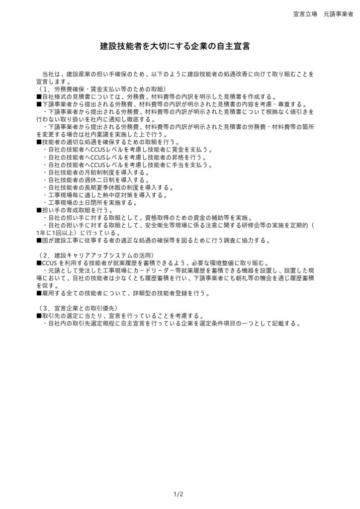 当社は、国土交通省が推進する「建設技能者を大切にする企業の自主宣言制度」(通称:職人いきいき宣言)に賛同し、宣言企業として登録いたしました。